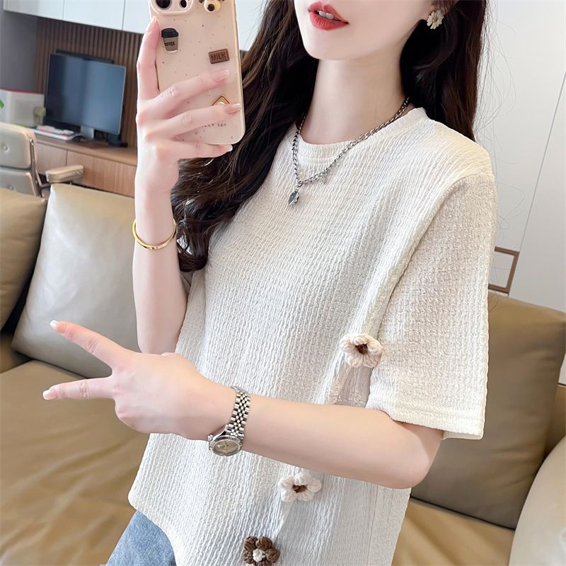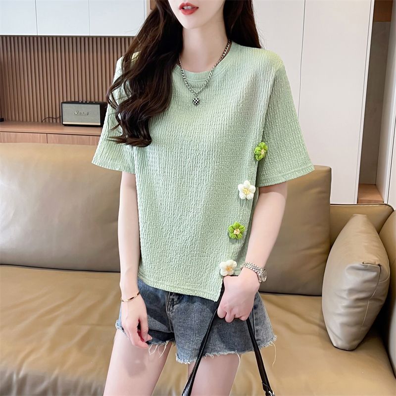 Главная страница > Женская футболка на правое плечо с короткими рукавами, летняя, в корейском стиле, свободный дизайн, короткий топ с асимметричным разрезом и цветочным принтом