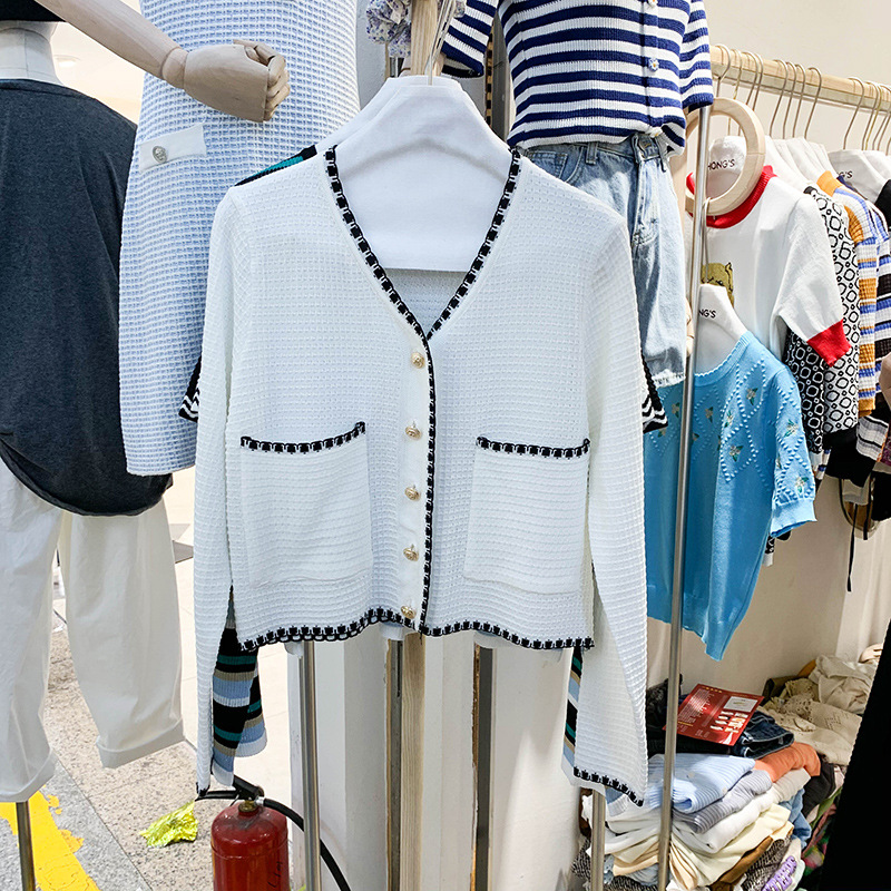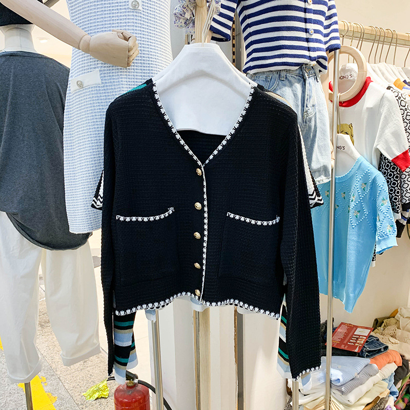 Главная страница > 2022 осень новый свитер контрастного цвета в стиле Chanel с V-образным вырезом, стройнящая элегантная вязаная женская одежда с тонкими длинными рукавами