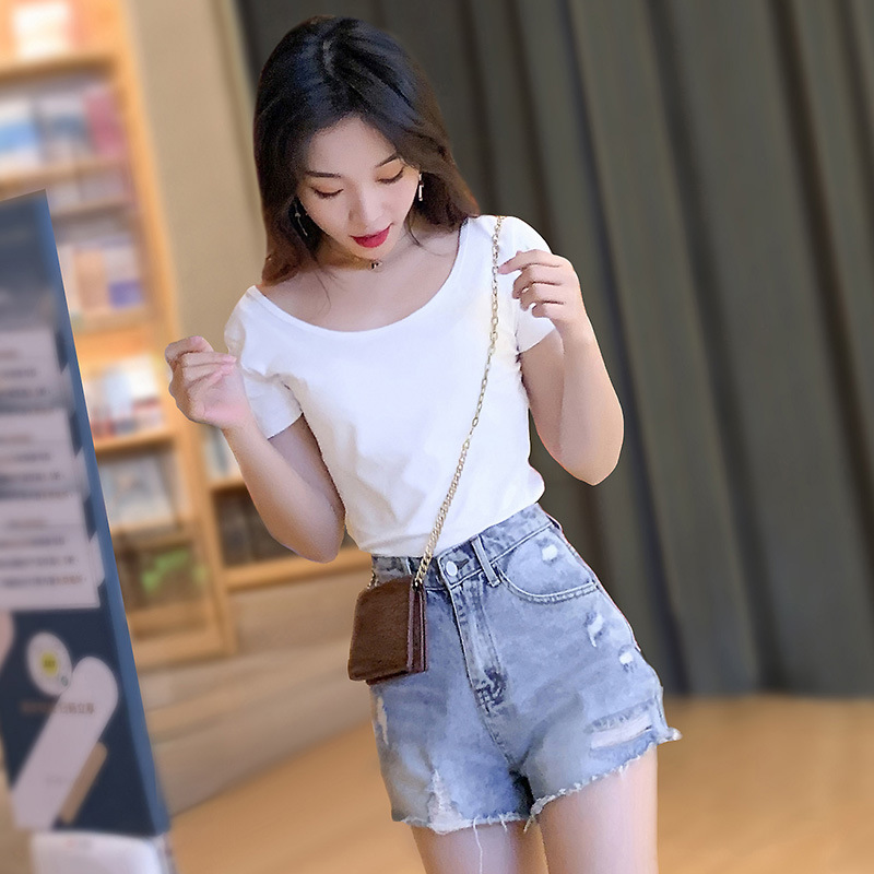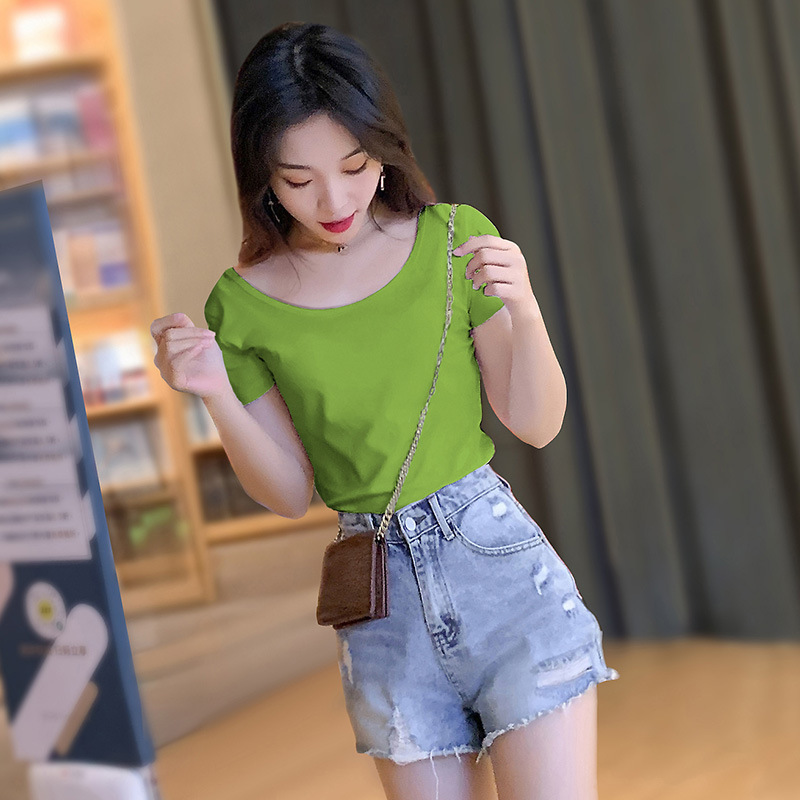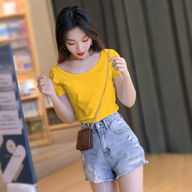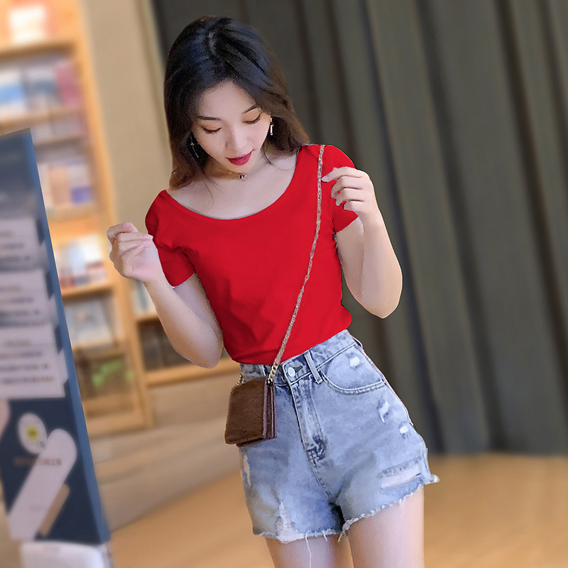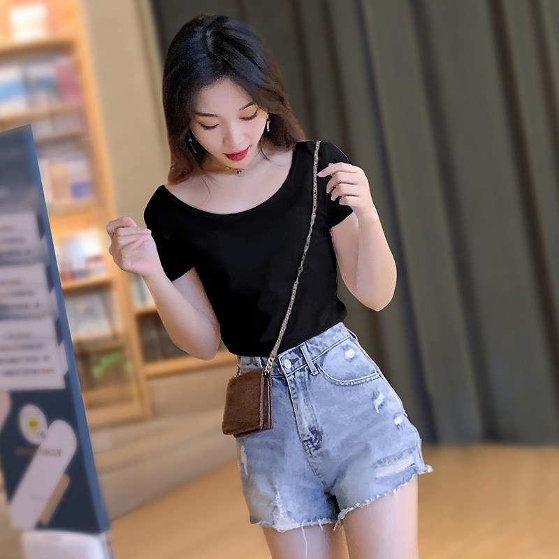 Главная страница > Белая футболка женская рубашка с коротким рукавом 2023 новый низкий воротник узкий U-образный нижний свитер хлопковый большой вырез весенний и осенний блузок