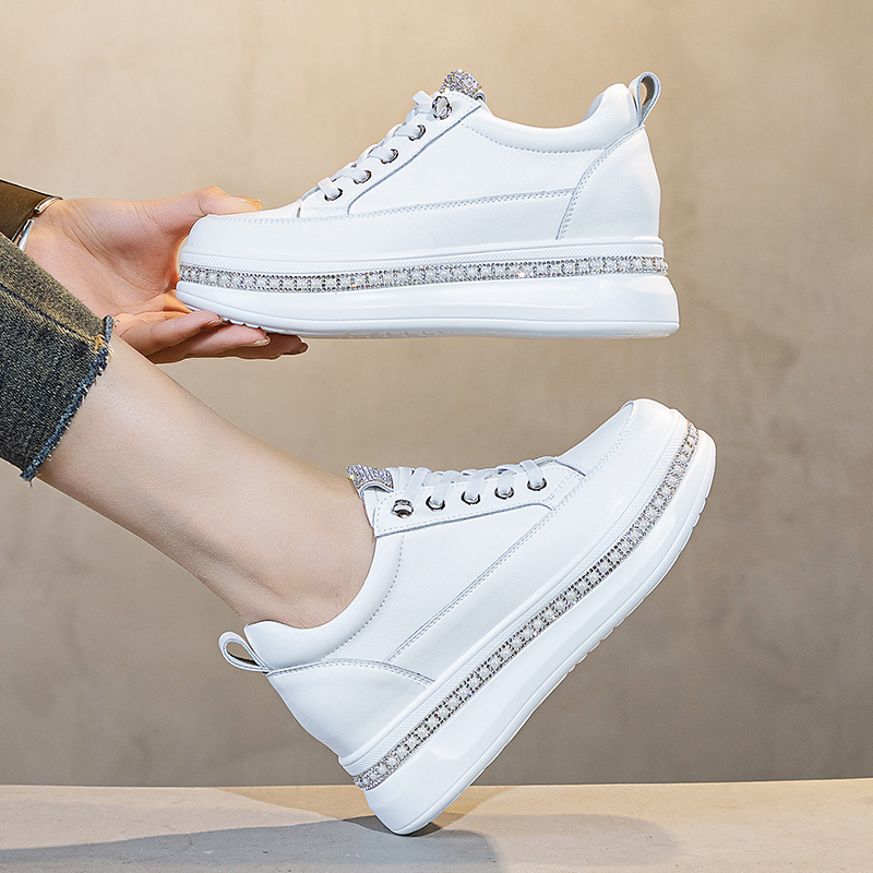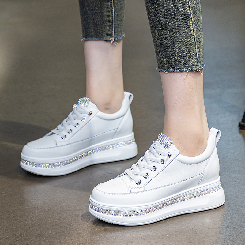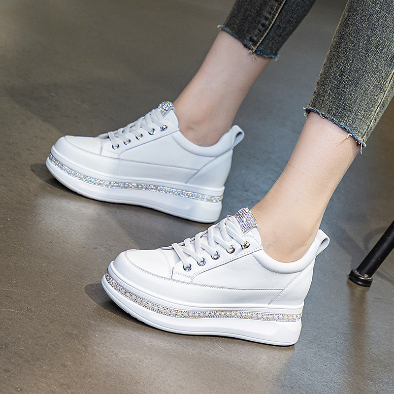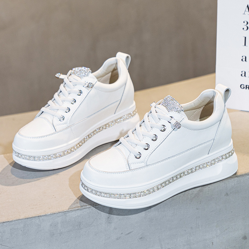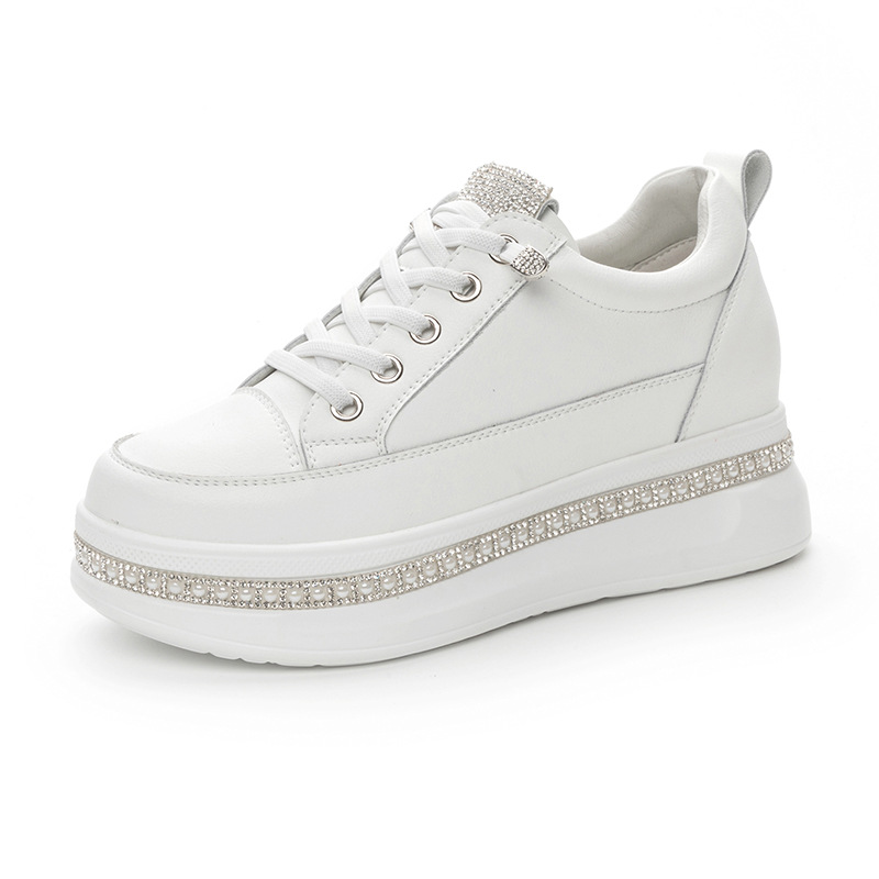 Главная страница > Белые туфли женские на толстой подошве с кексом увеличенные 6 см со стразами и жемчугом на резинке, универсальные базовые повседневные кроссовки на шнуровке