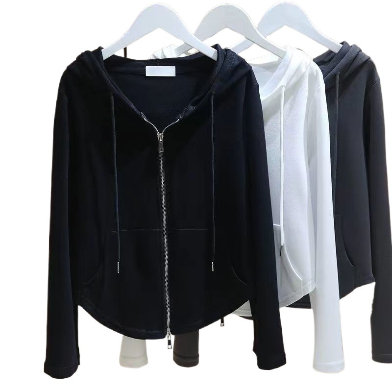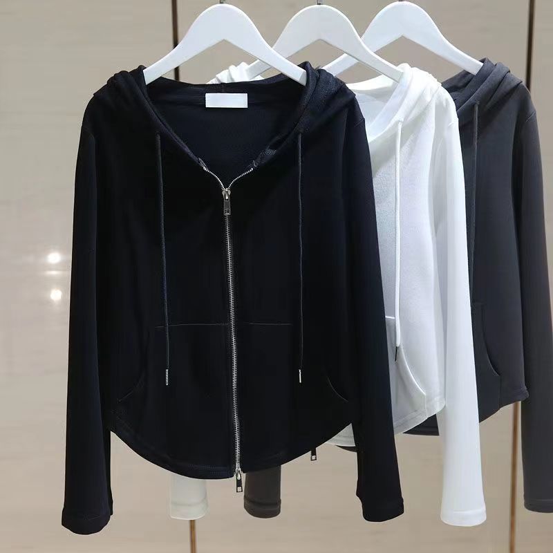 Главная страница > Нижняя куртка белая футболка с капюшоном Женская футболка с длинными рукавами весна и осень тонкая короткая кардиган куртка на молнии
