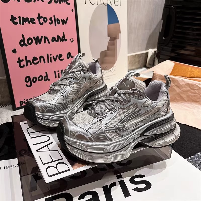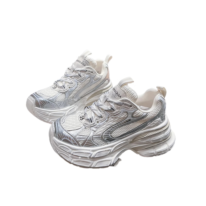 Двухслойные женские кроссовки в стиле "Парижские папины туфли" 2025 года, новые, на толстой платформе, повседневные, для невысоких женщин, серебристого цвета.