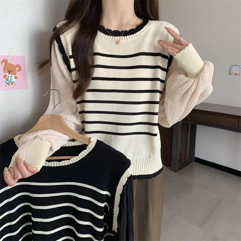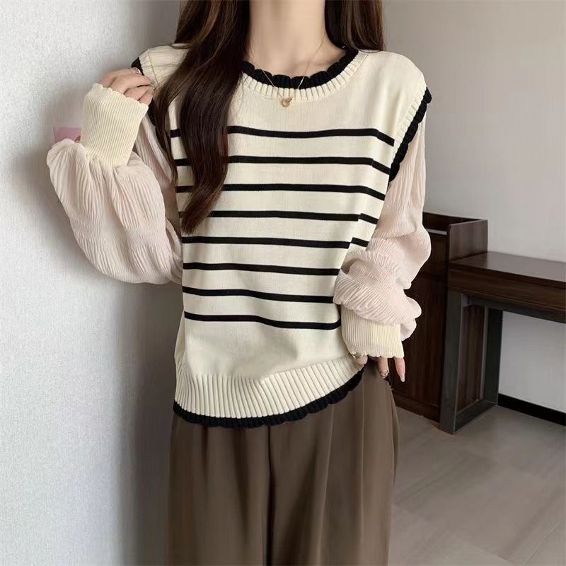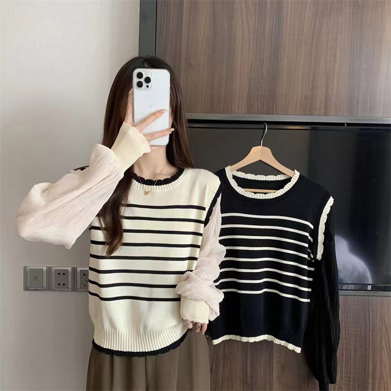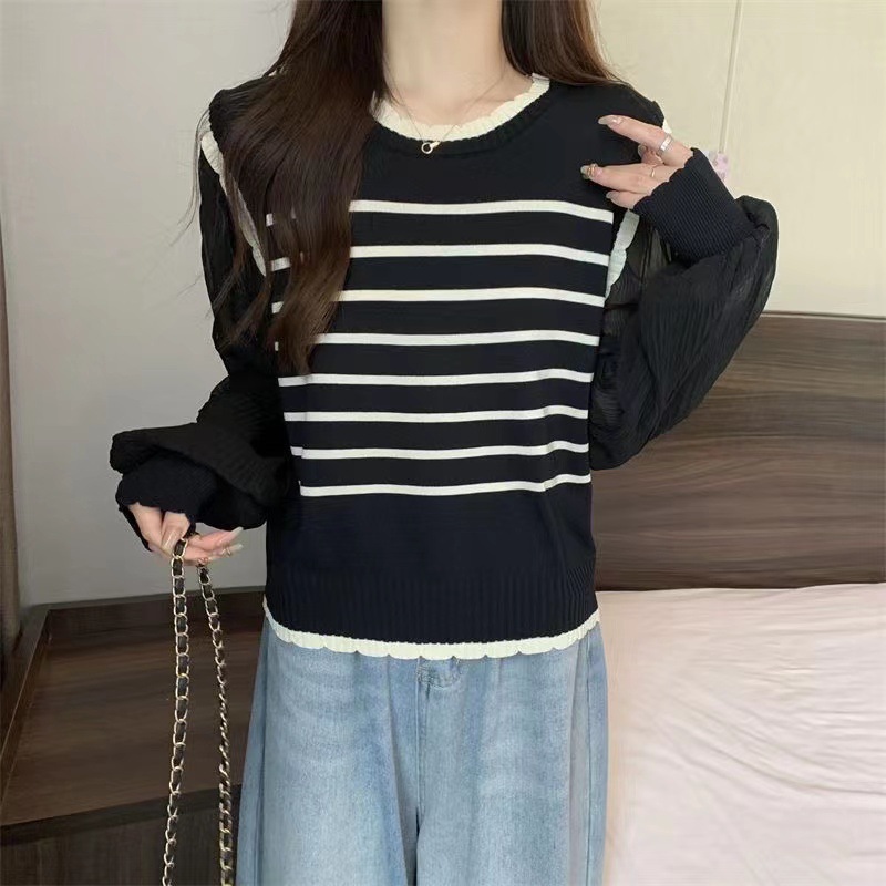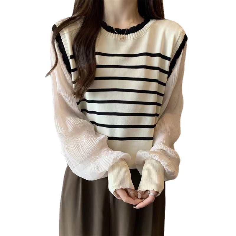 Главная страница > Круглый вырез полосатый шить шифон слоеного рукава свитер для женщин Весна Новый похудения приталенный-Fit молодой вид Топ для женщин