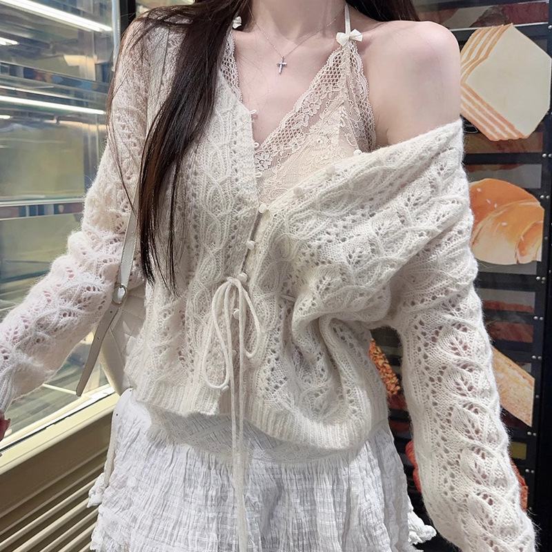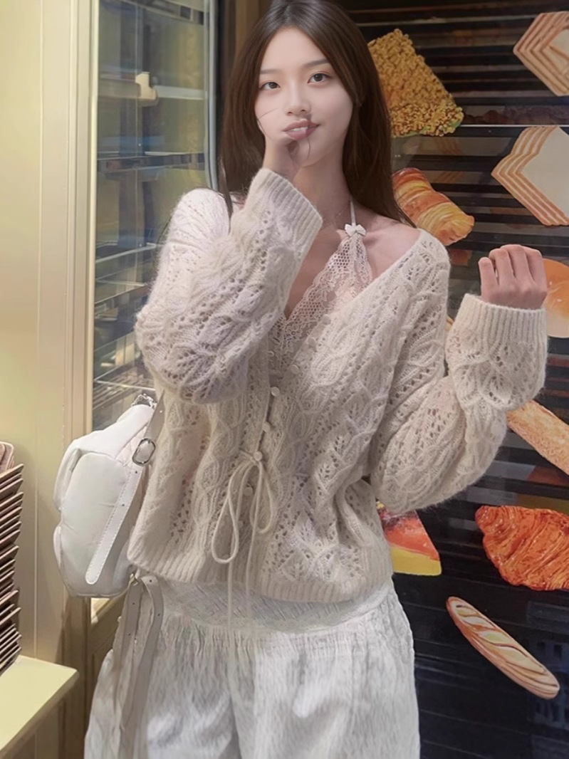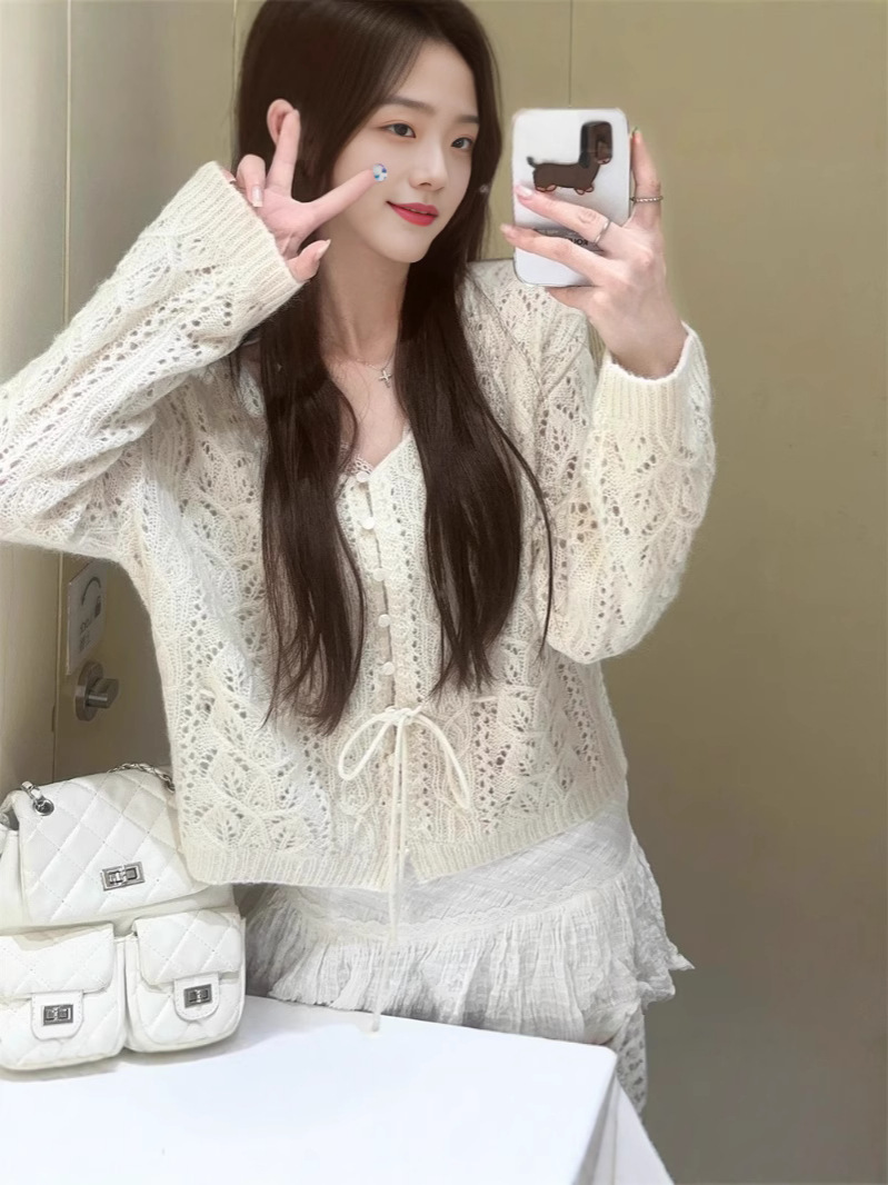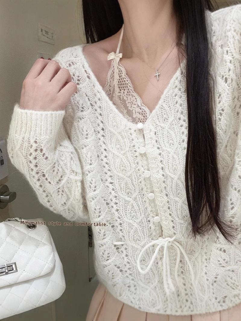 Весенне-осенний нежный стиль, молочно-белый полый вязаный крючком свитер, кардиган, женский новый вязаный жакет из мохера с v-образным вырезом, топ