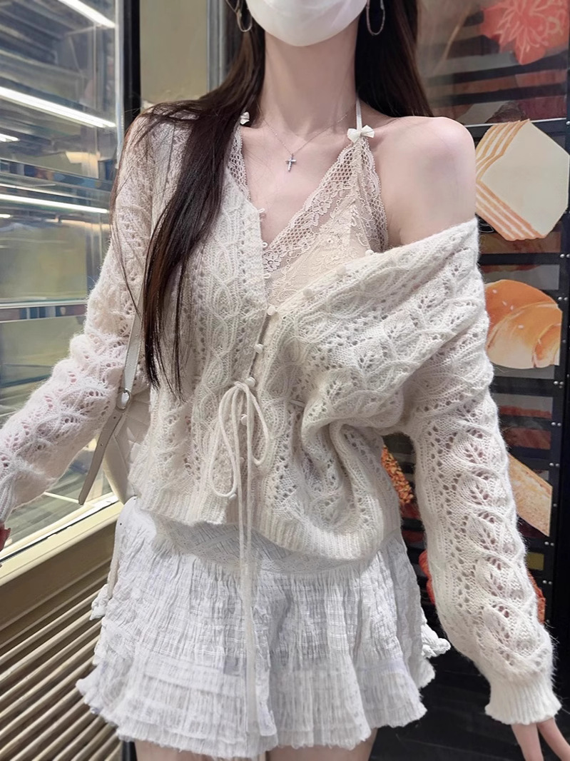 Главная страница > Весенне-осенний нежный стиль, молочно-белый полый вязаный крючком свитер, кардиган, женский новый вязаный жакет из мохера с v-образным вырезом, топ