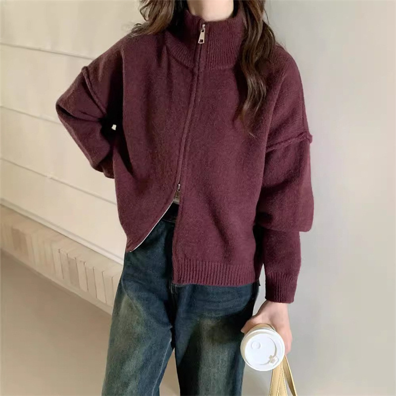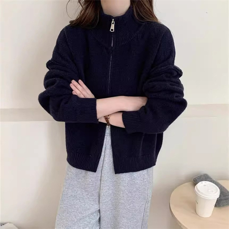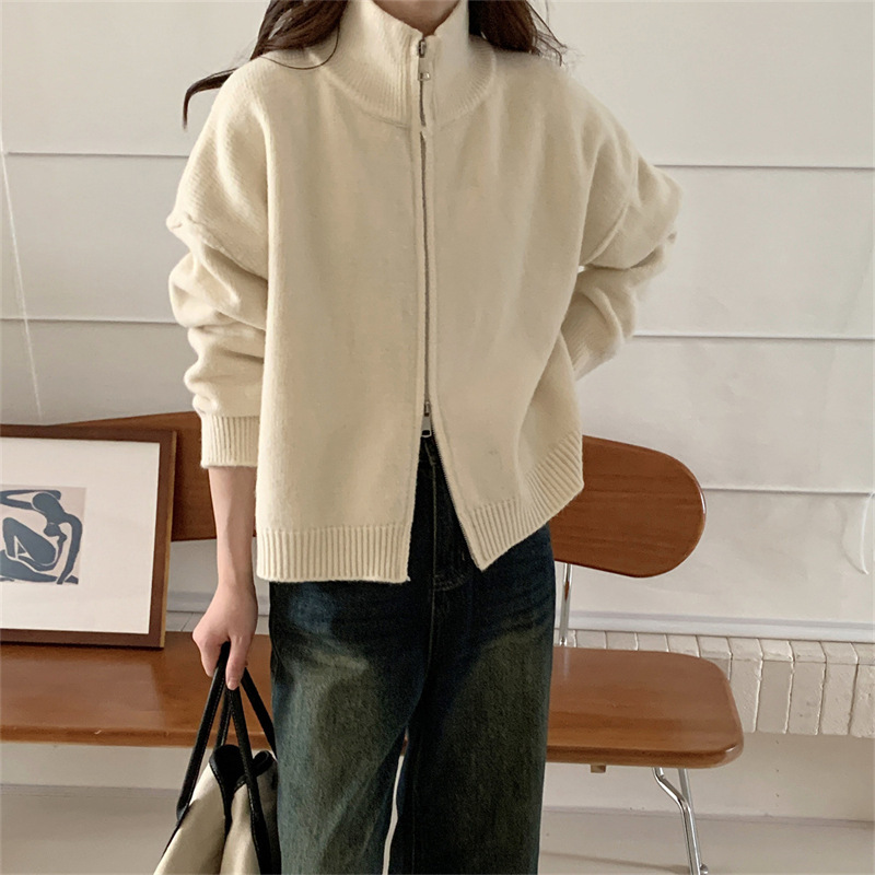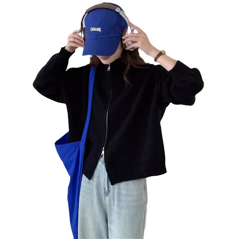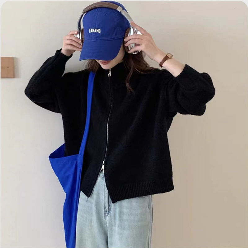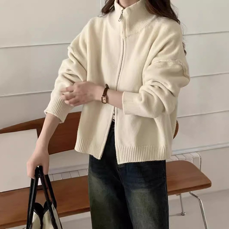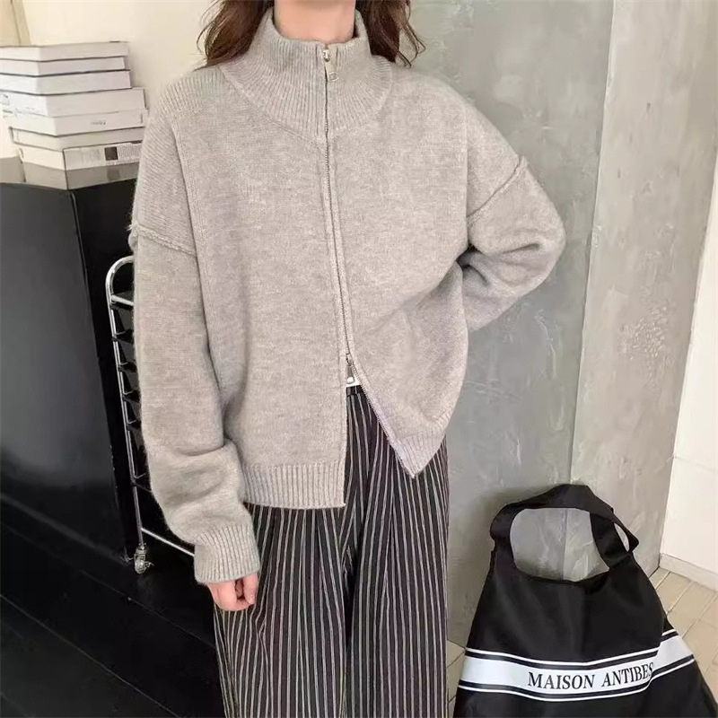 Главная страница > Простой вязаный кардиган с двойной молнией в корейском стиле для женщин, осенне-зимний новый стиль, ленивый стиль, свободный утягивающий свитер, модная куртка