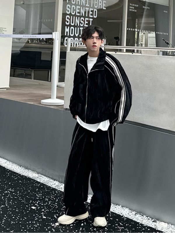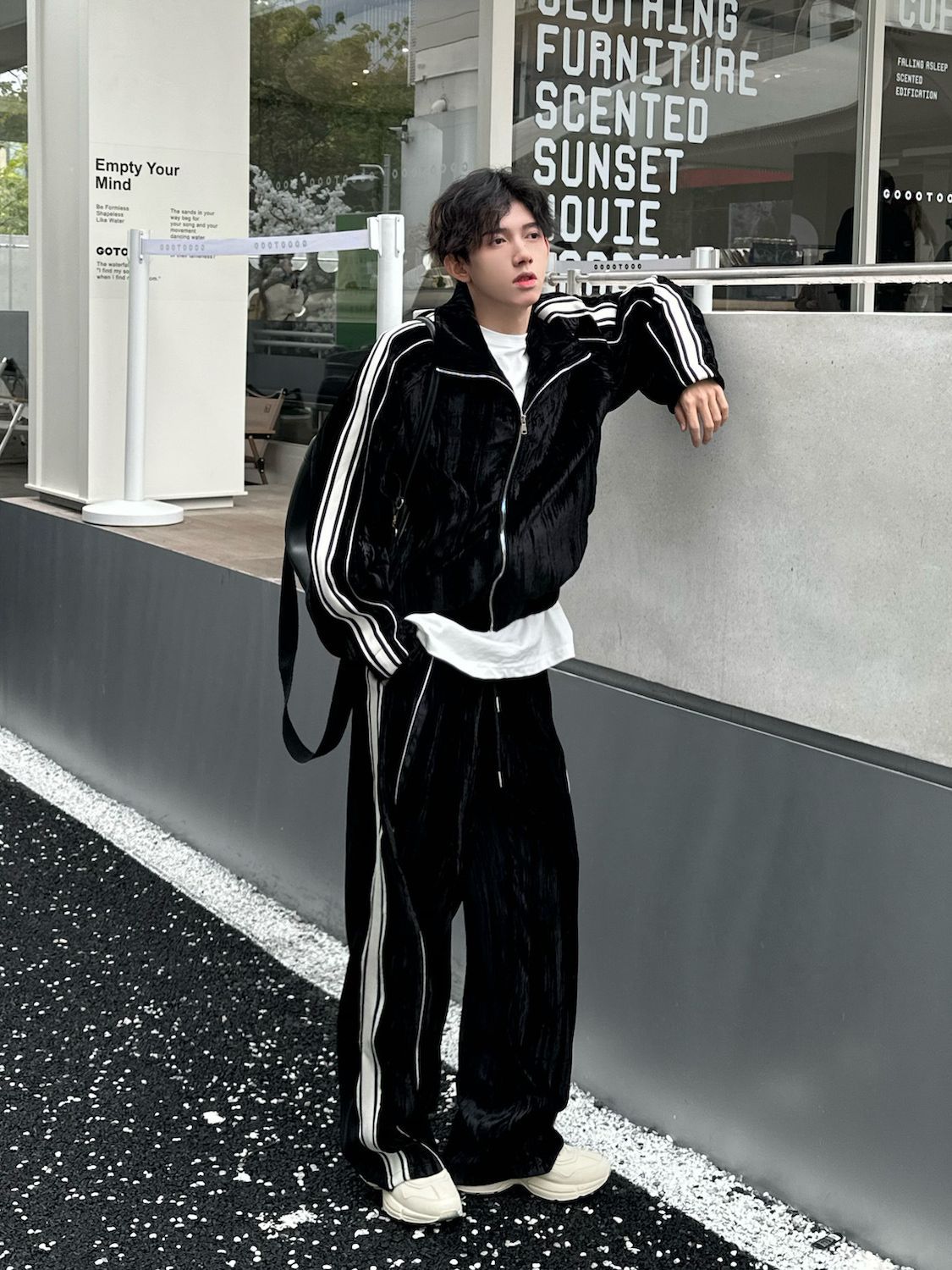 Главная страница > 23 осень Pu Shuai высококачественный кардиган пальто, соответствующий цвету полосатый свитер, комплект из двух предметов, пара, повседневный спортивный костюм для мужчин