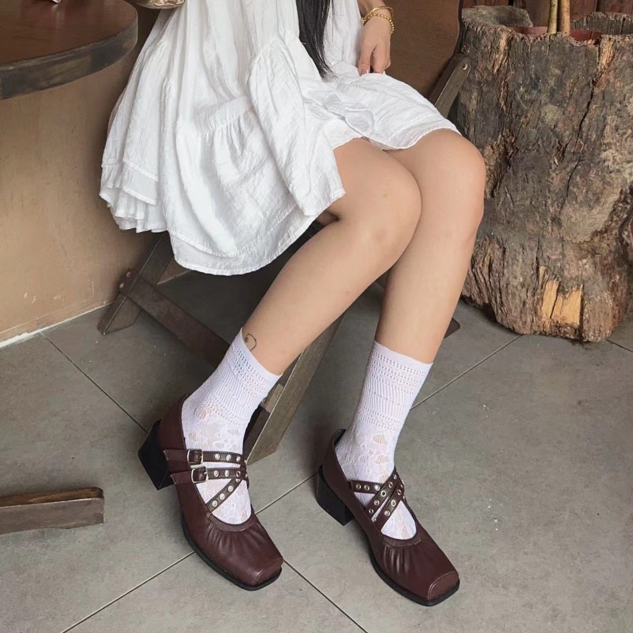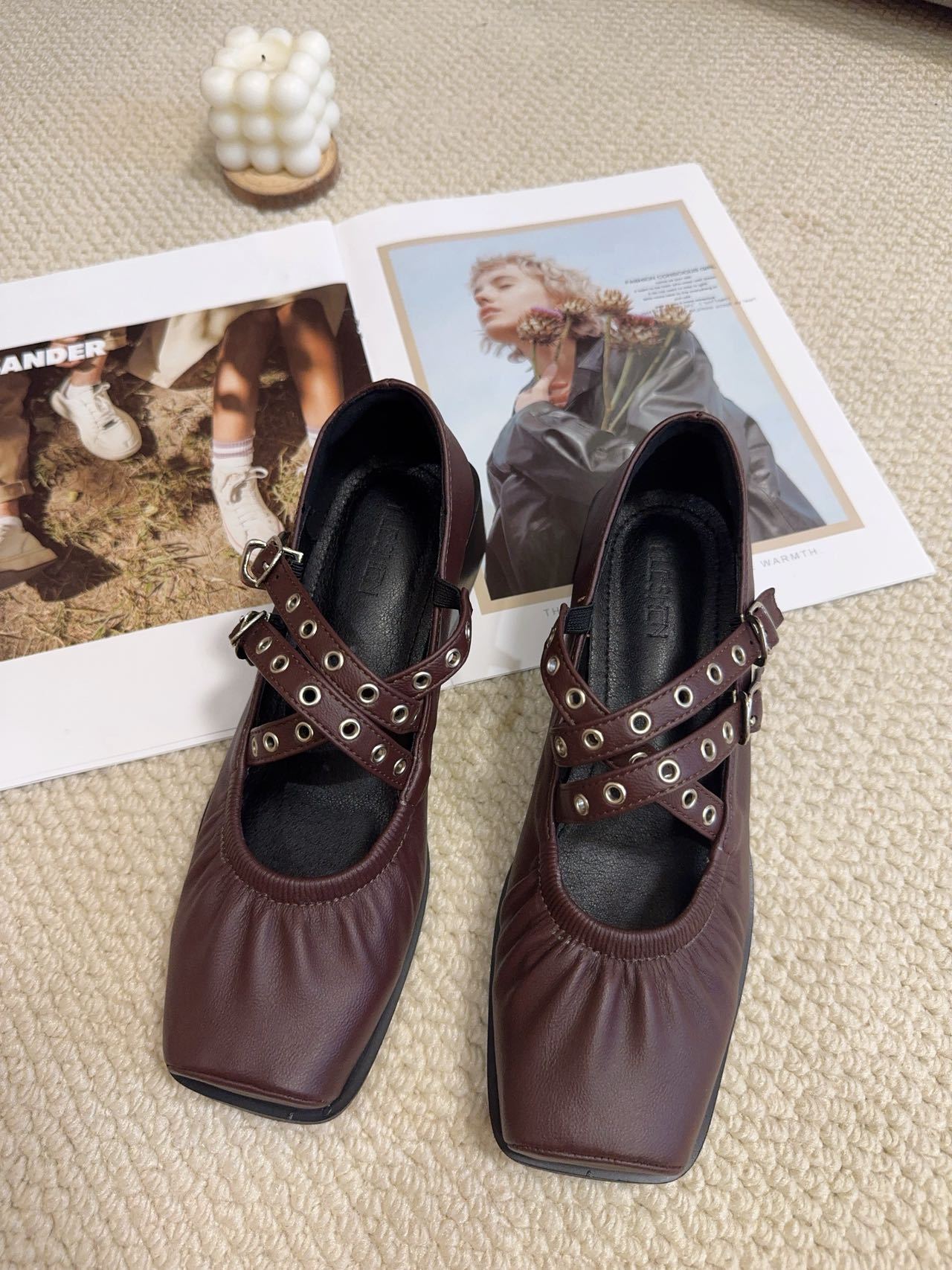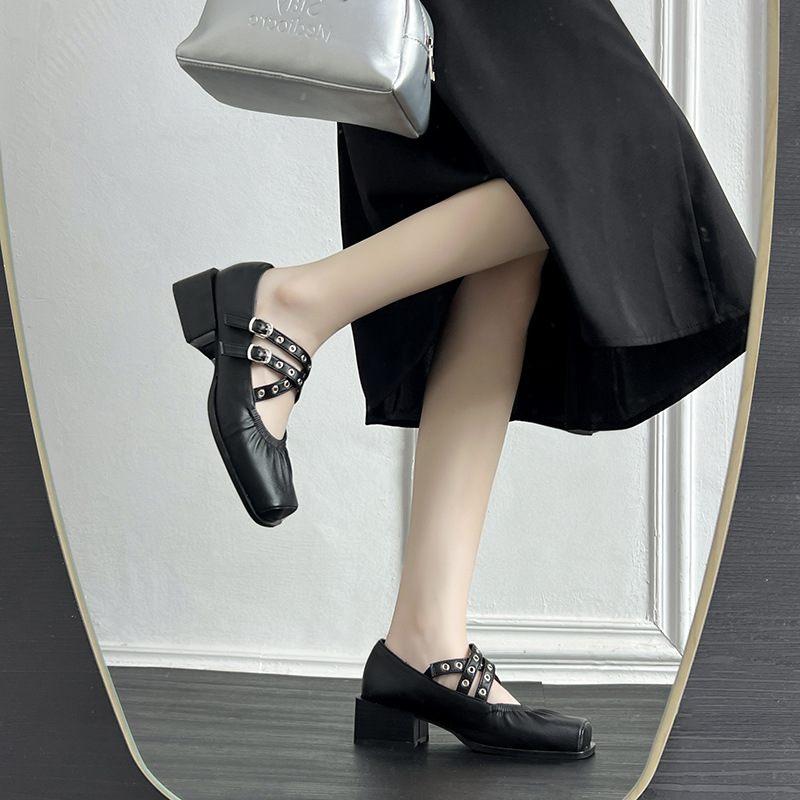 Главная страница > Женские балетки с перекрестными ремешками, неглубокие, весна 2025, квадратный носок, толстый каблук, универсальные туфли Мэри Джейн на высоком каблуке