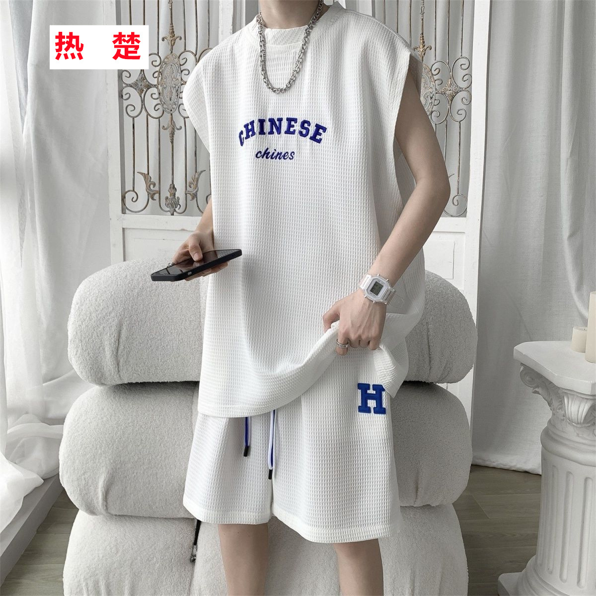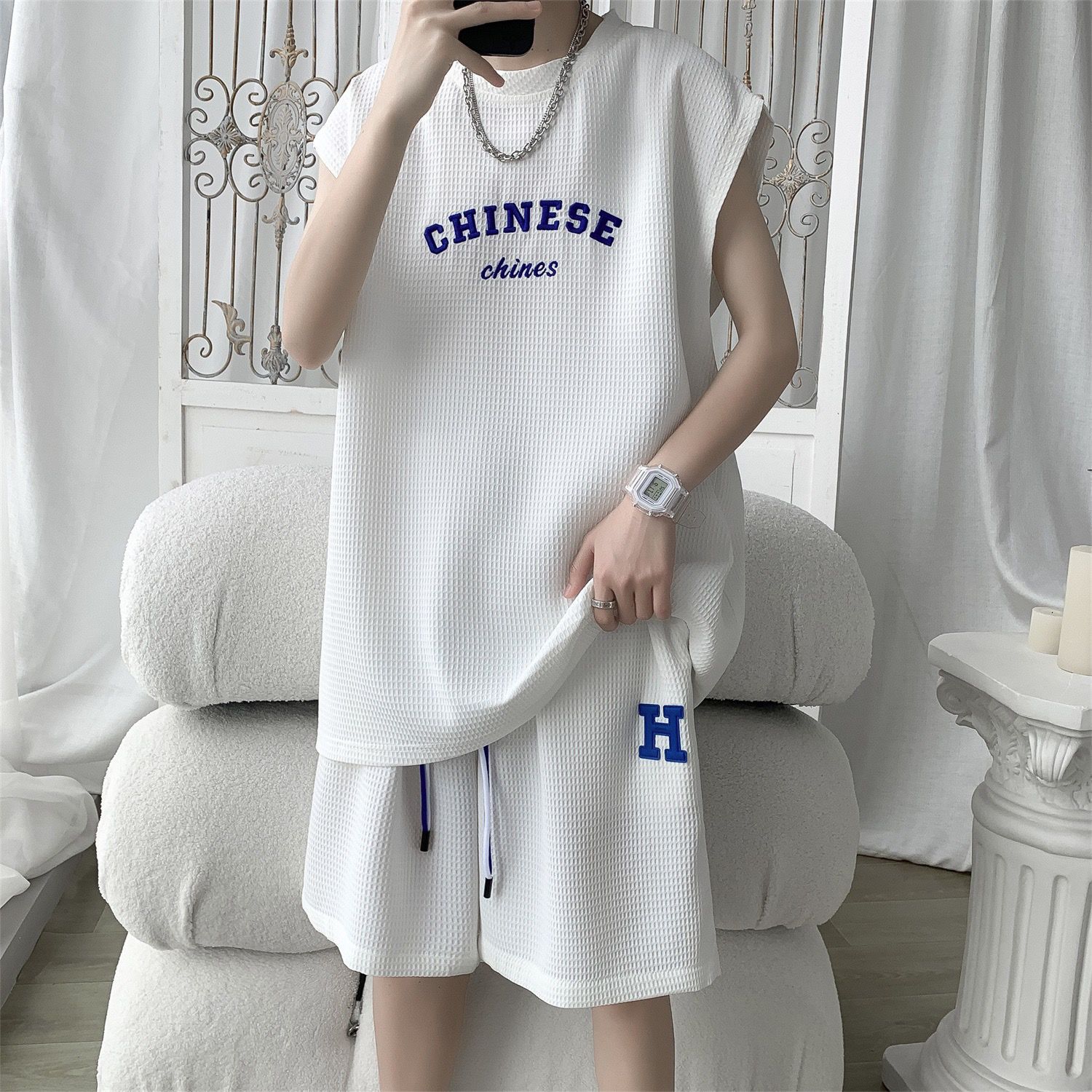 Летние вафли для мужчин повседневные футболки без рукавов для мужчин шорты из двух частей для подростков