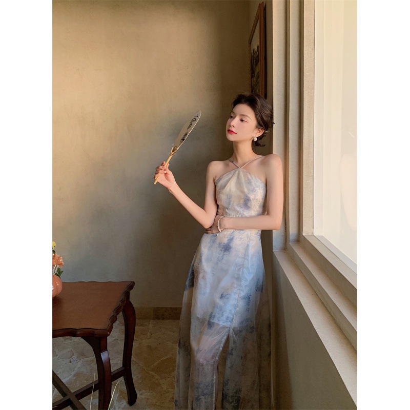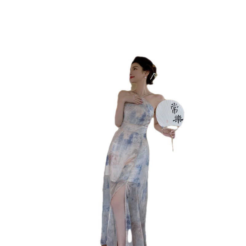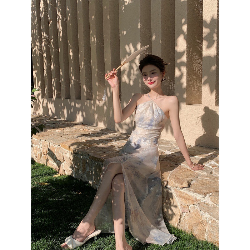 Главная страница > Платье на подтяжках с принтом на шее, весна 2025, новая женская шифоновая юбка с разрезом и открытой спиной, чайный цвет