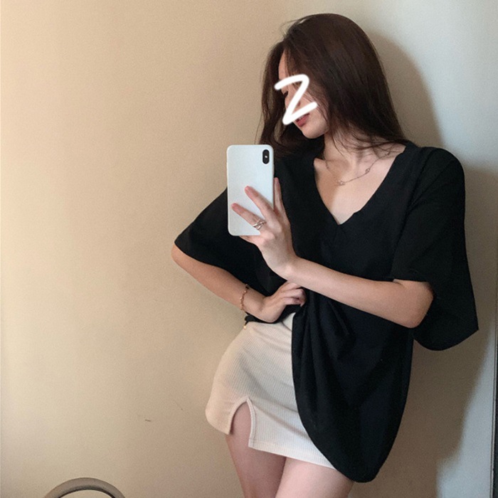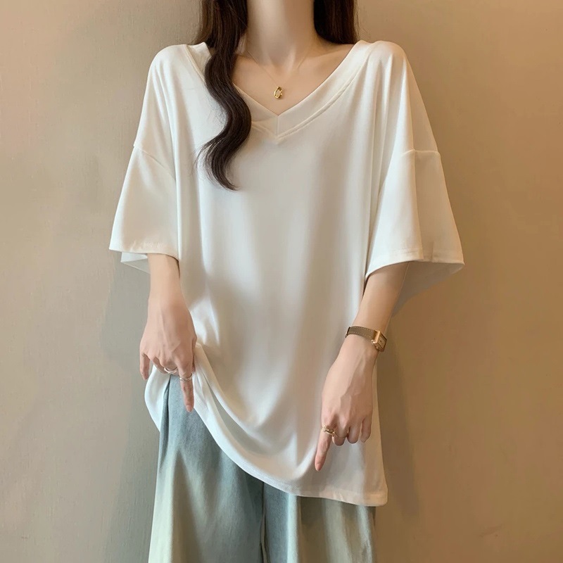 Главная страница > Женская футболка с v-образным вырезом из модальной нити, 260 г, с коротким рукавом, летняя длинная модель, свободная версия большого размера, стройнящая и элегантная, дропшиппинг.