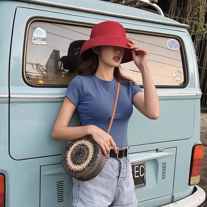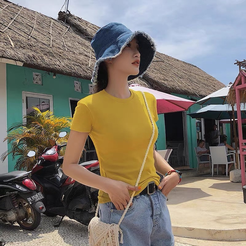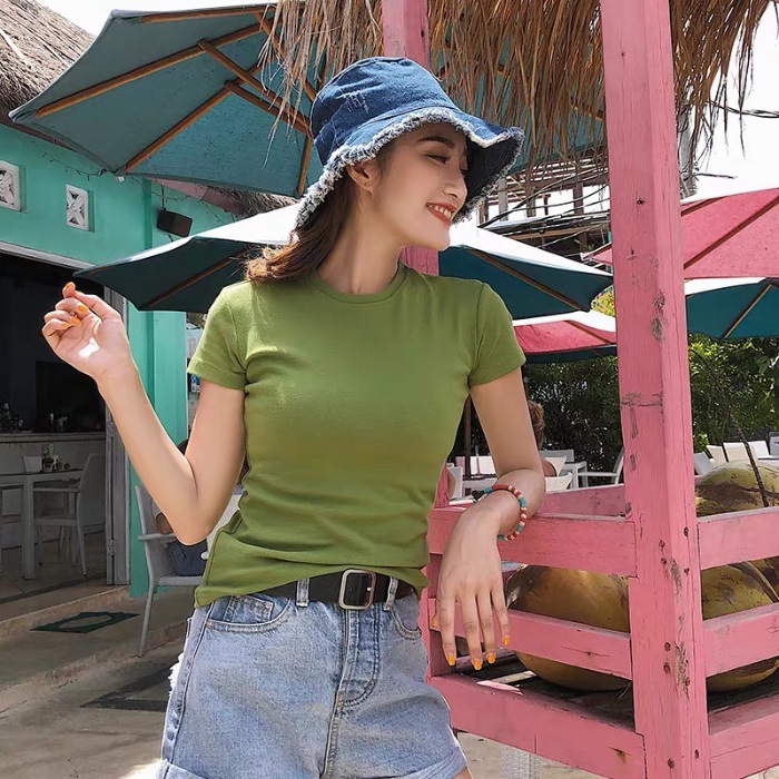 Главная страница > Оранжевая футболка с короткими рукавами 2025 новая летняя сплошная стройная футболка с половиной рукава