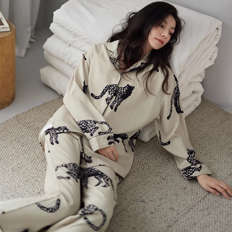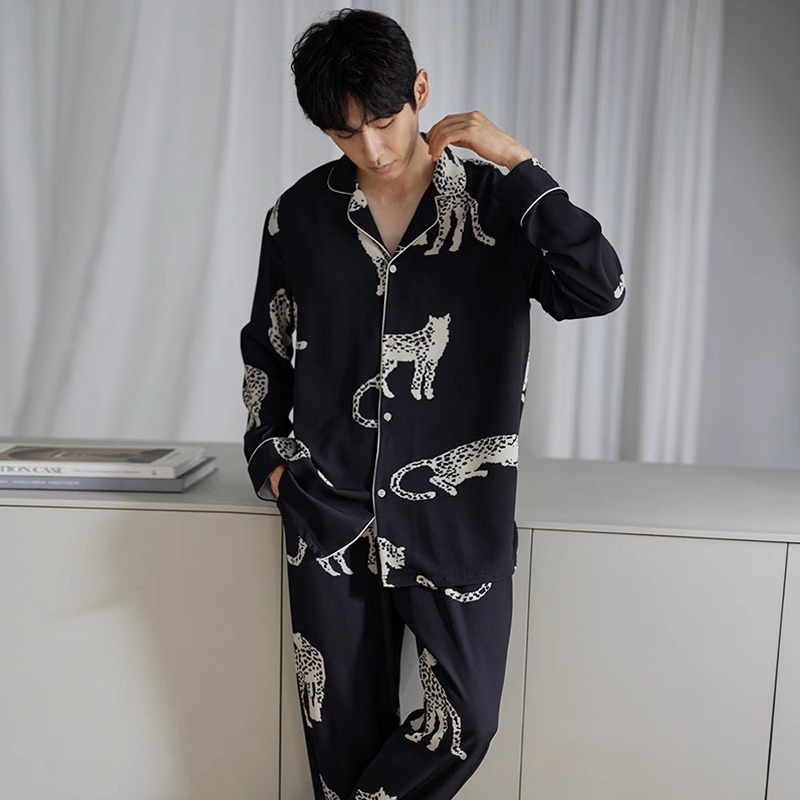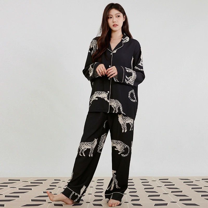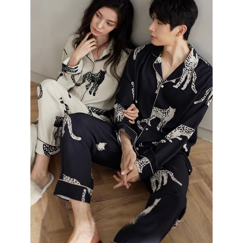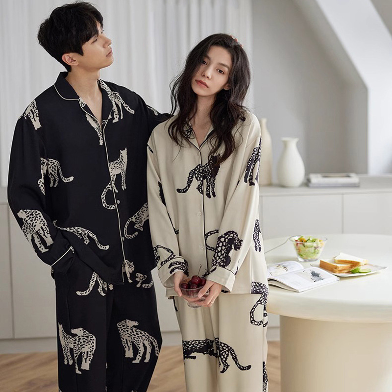 Главная страница > Высококачественные пижамы для пар из чистого хлопка, весенне-осенние тонкие леопардовые свободные повседневные мужские домашние костюмы с длинными рукавами, женский костюм