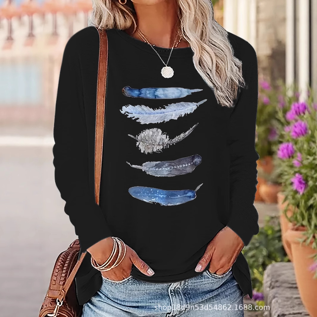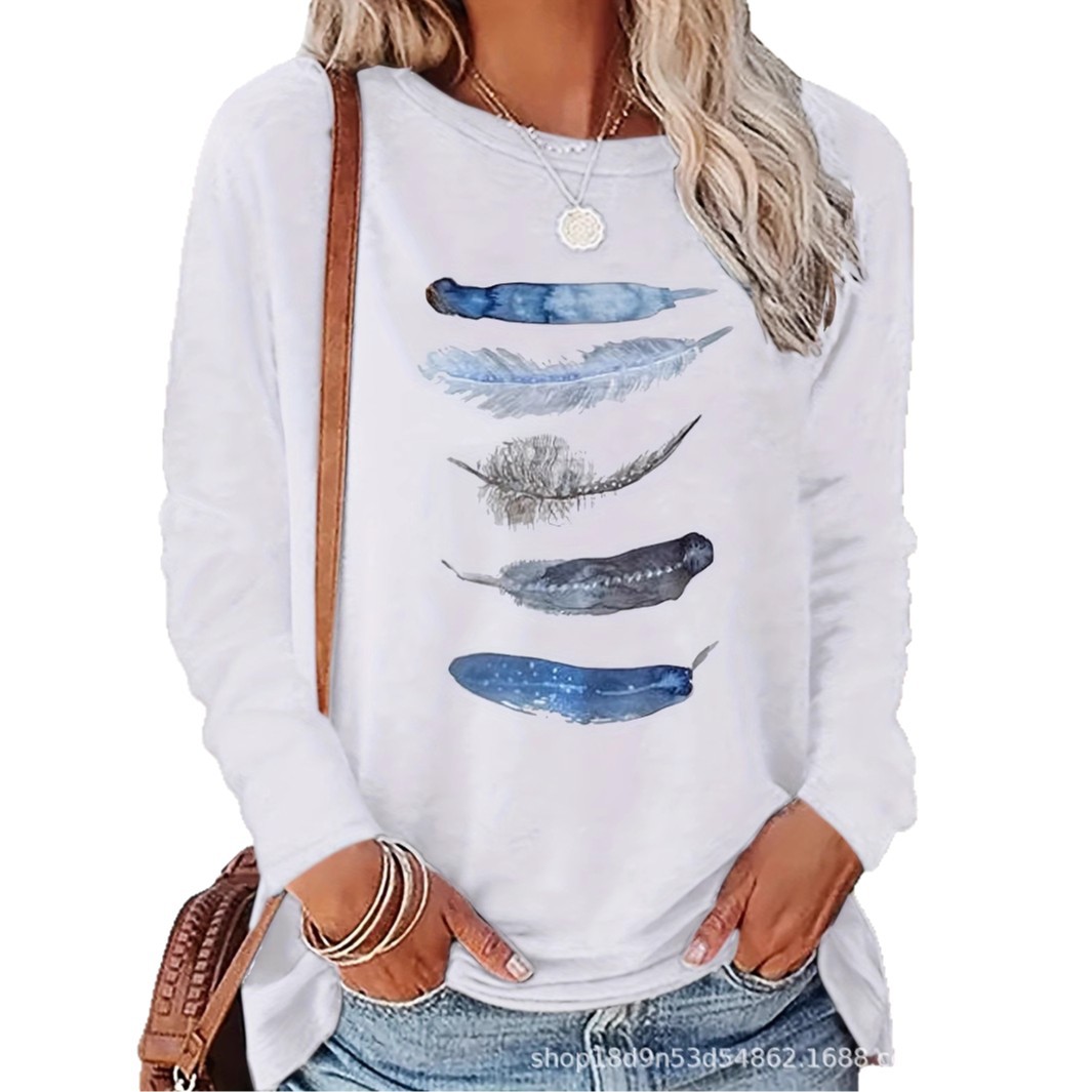 Главная страница > Женская футболка с длинными рукавами и принтом для внешней торговли, осенне-зимняя трансграничная новая модная повседневная футболка с круглым вырезом и длинными рукавами, топы для женщин