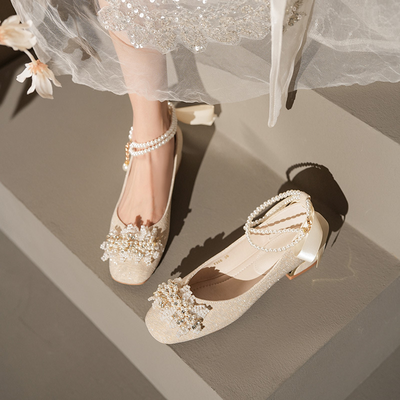 7366-53 заостренный французский стиль высокого уровня Мэри Джейн подружка невесты обувь жемчужный ремень свадебные туфли женские лодыжки лук