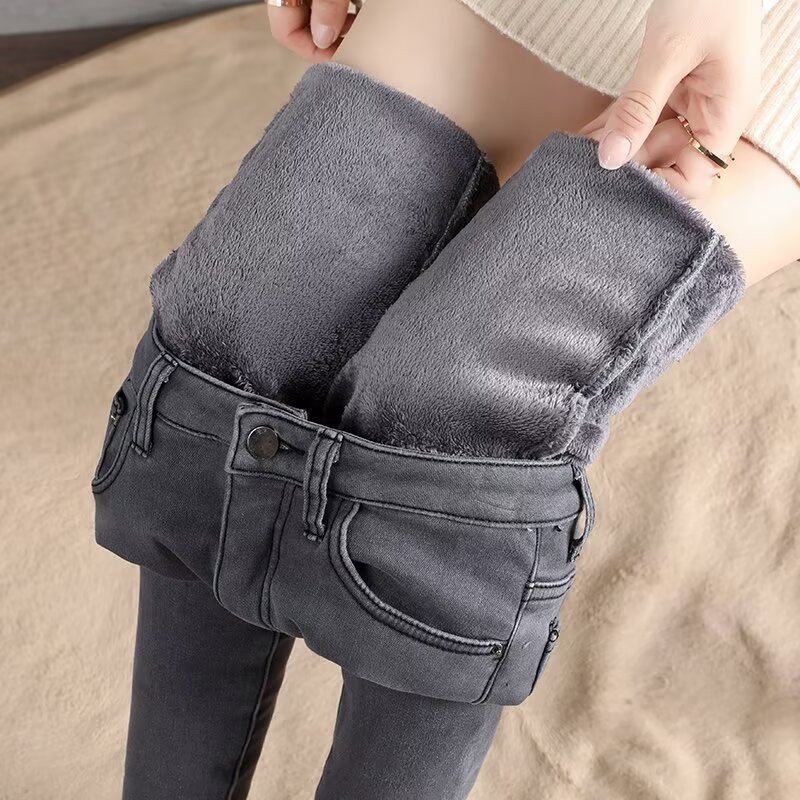 Плюшевая утолщение теплые джинсы женский 2024 высокая талия плотный темперамент ленивый тренд осенние застежки на молнии