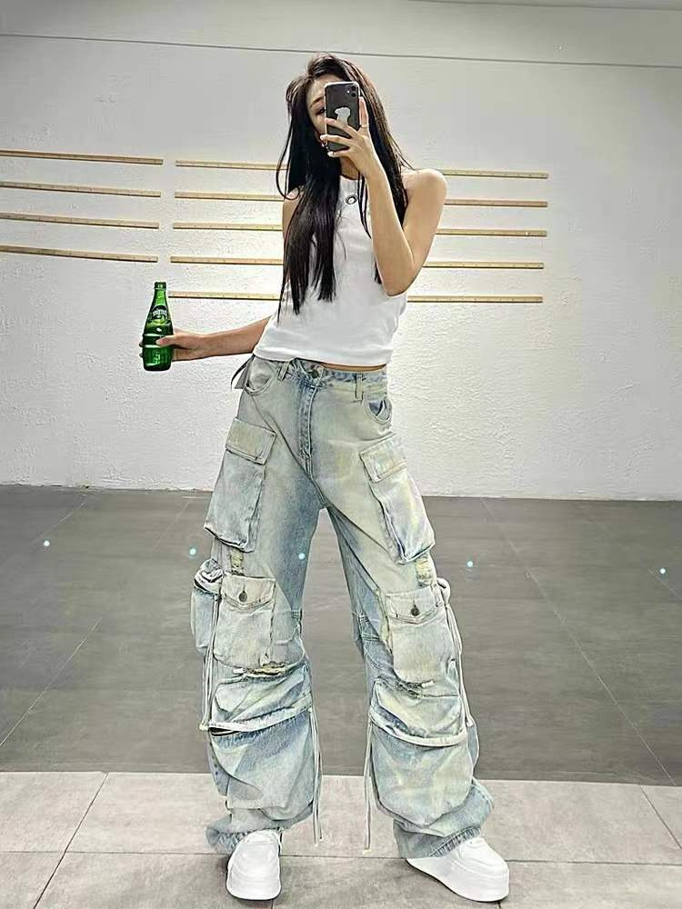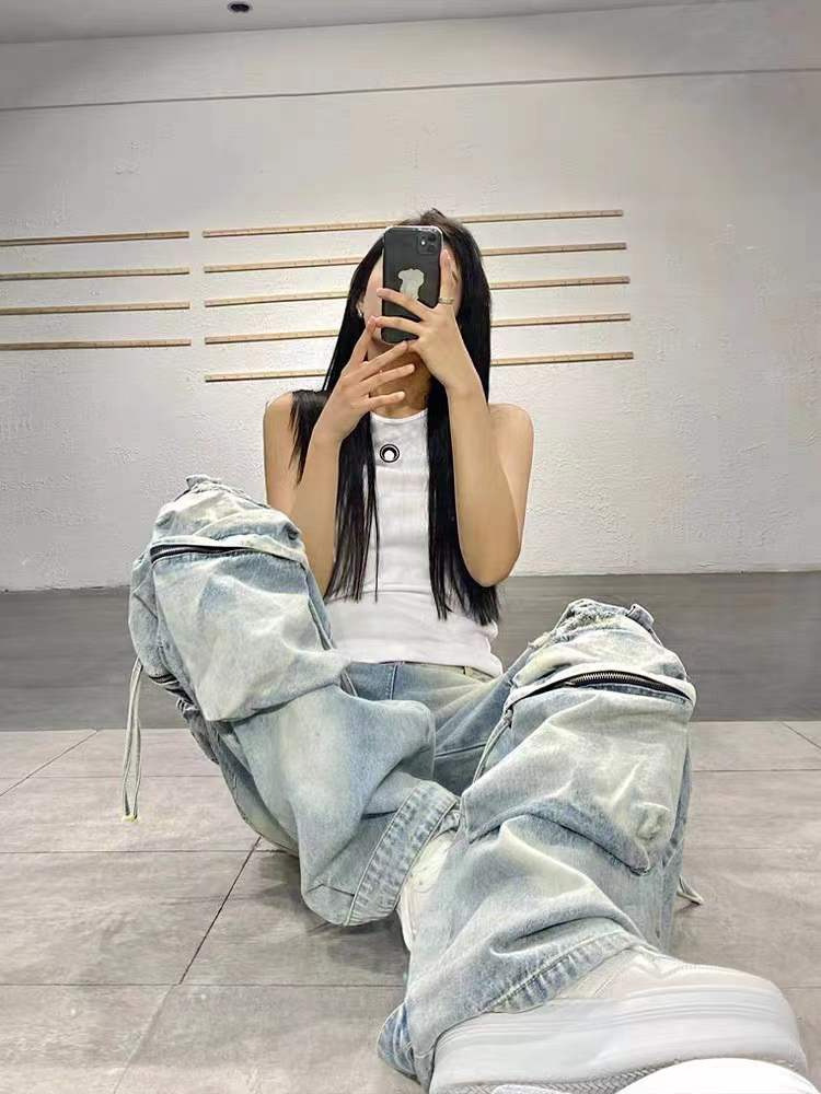 Нишевые дизайнерские чувства дикие, тонкие прямые свободные брюки, дырки, стирание тяжелые, многокарманные джинсы, женские