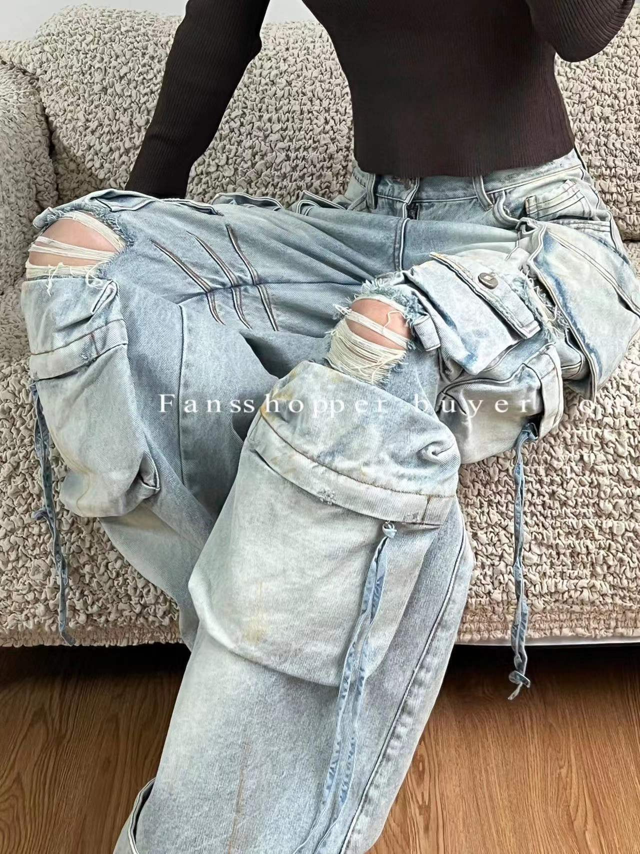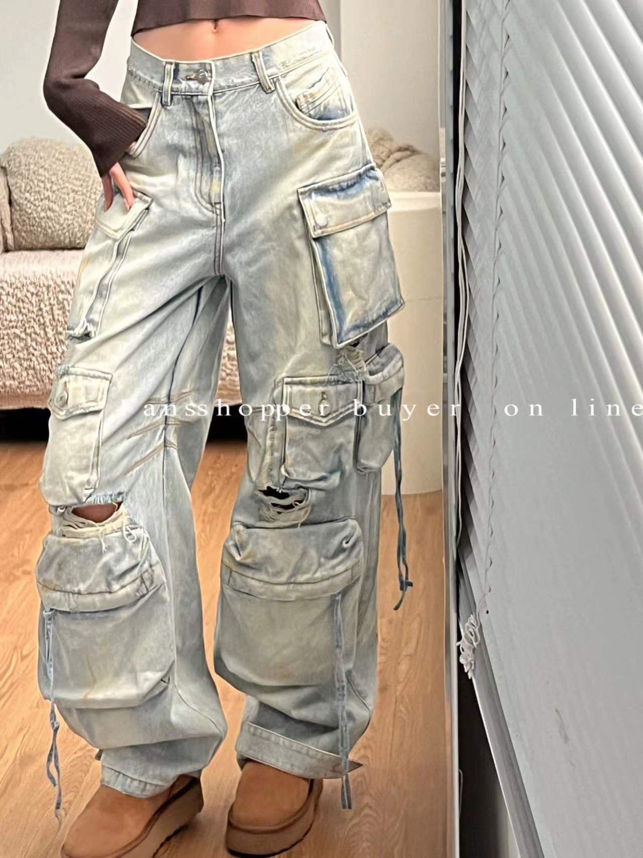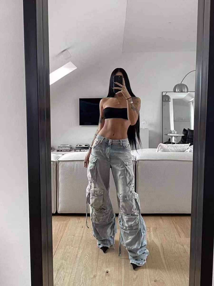 Главная страница > Нишевые дизайнерские чувства дикие, тонкие прямые свободные брюки, дырки, стирание тяжелые, многокарманные джинсы, женские