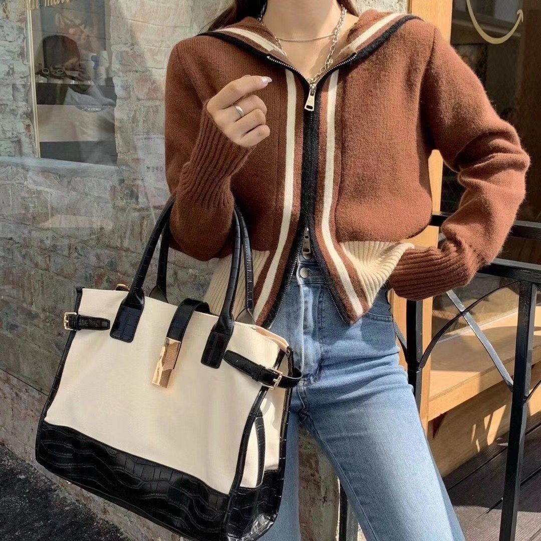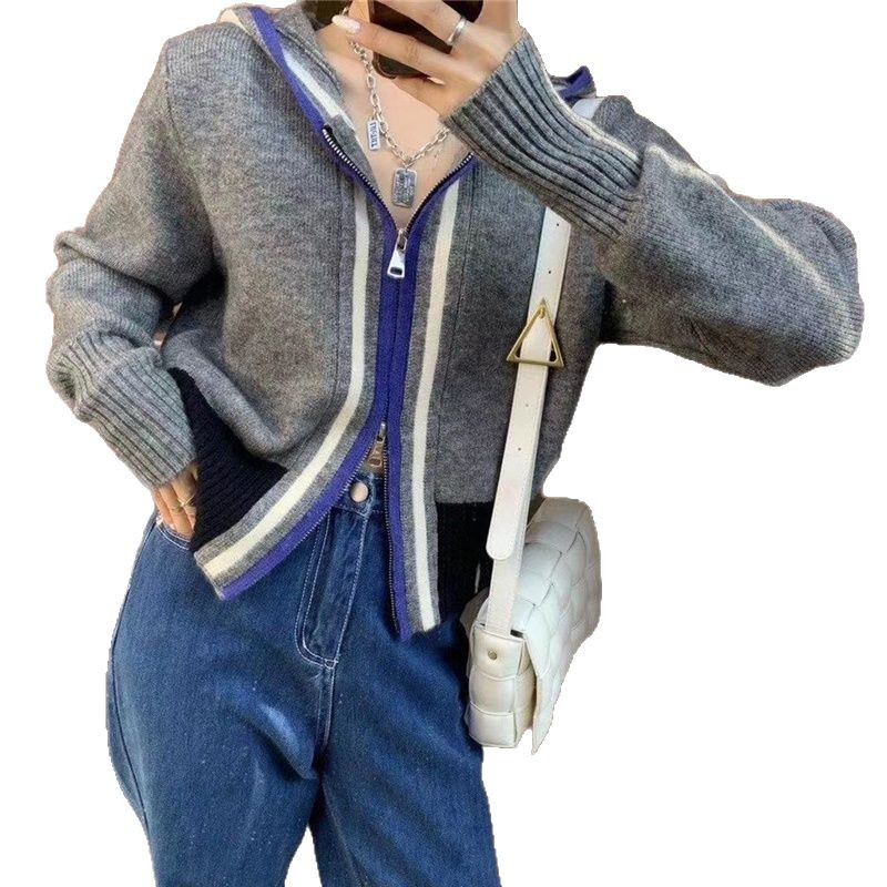 Главная страница > Контажный цвет вязаный свитер с капюшоном для женщин 2025 осень-зима дизайн чувство кардиган повседневный внешний свитер на молнии свитер короткая куртка