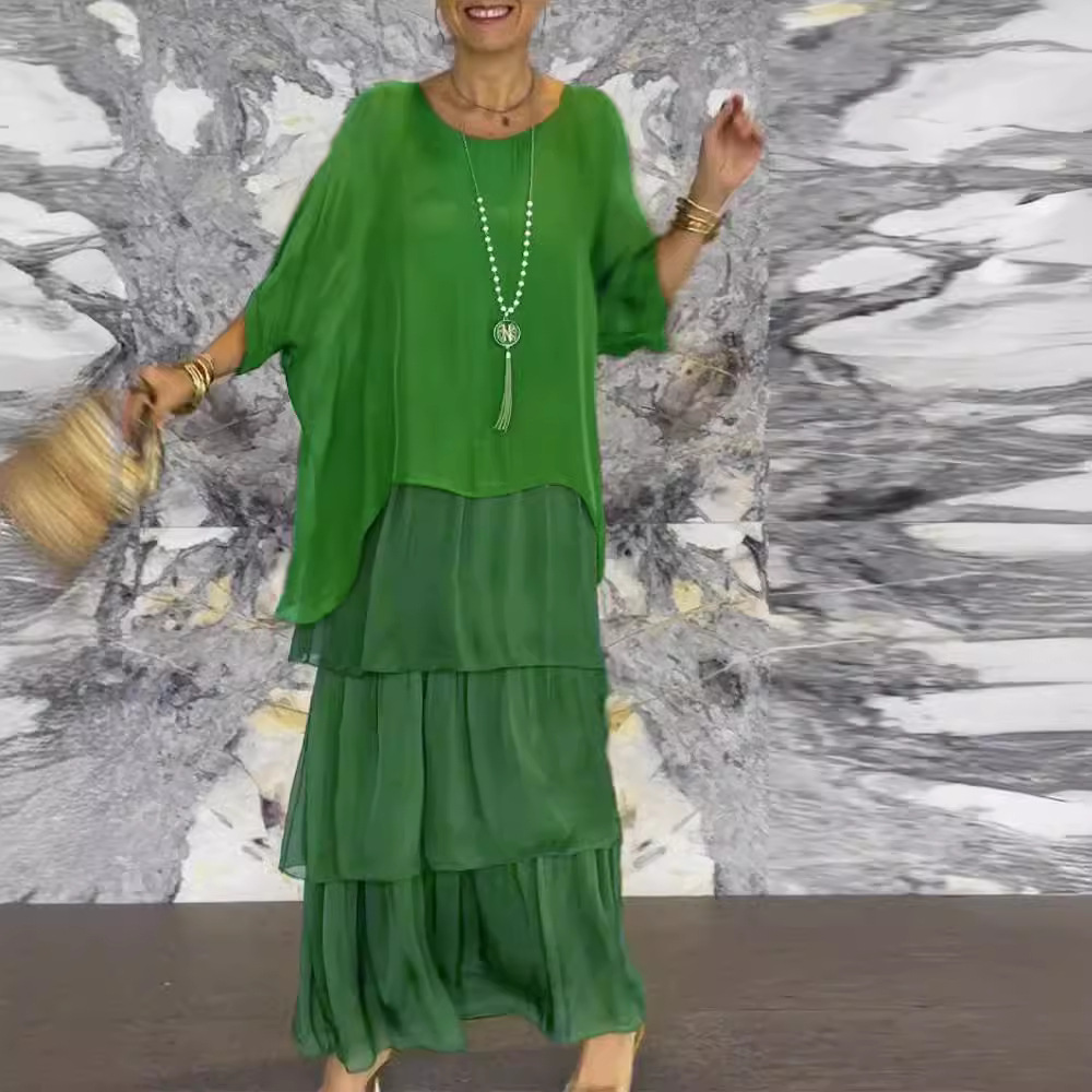 2024 европейской и американской моды новый шифон сетки Batwing рукавом вокруг шеи длинное платье