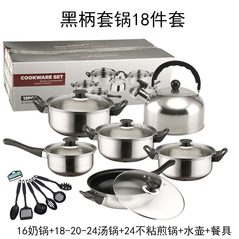 Трансграничный специализированный для кастрюль из нержавеющей стали с деревянной ручкой с черными ручками набор кастрюль с чайником кастрюля с молоком кастрюля сковорода сковорода 12/18PCS