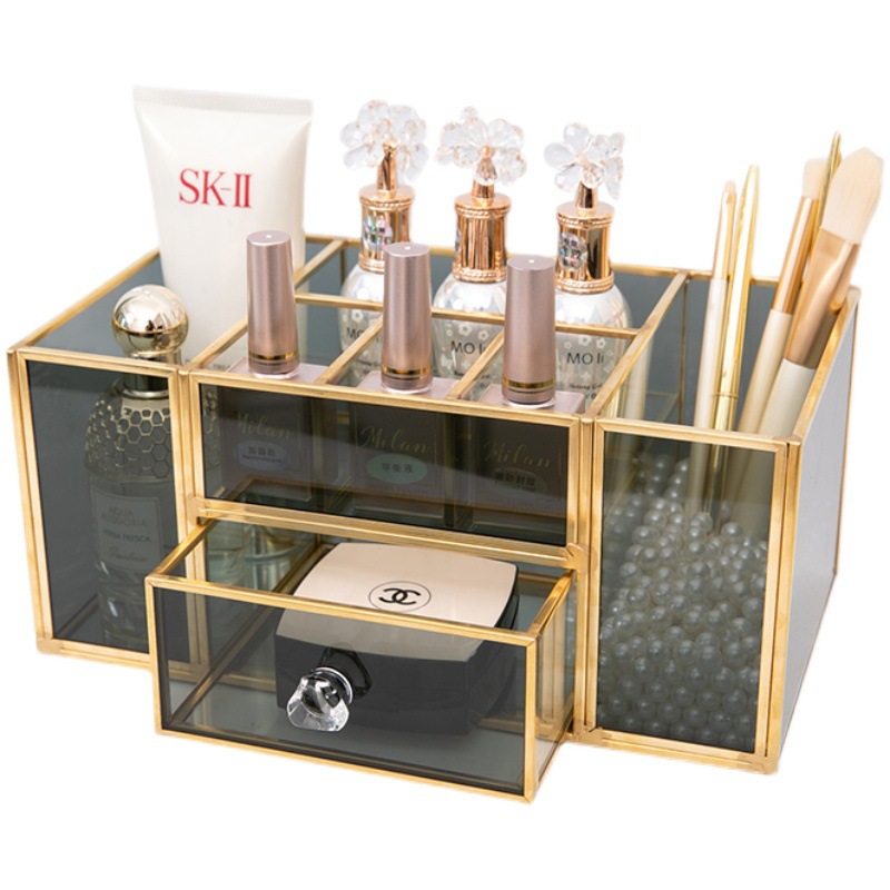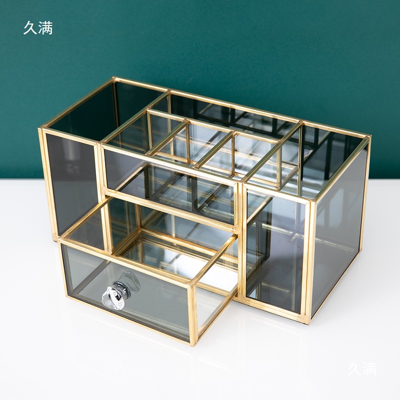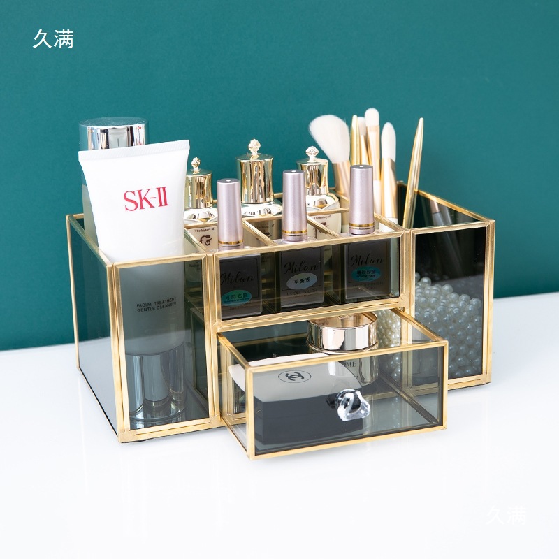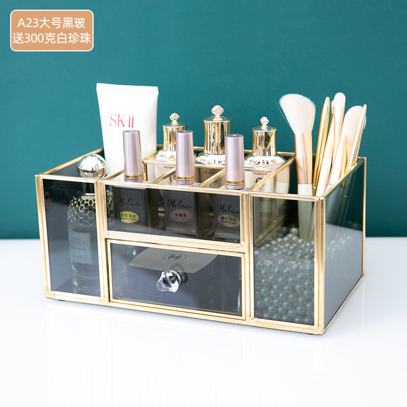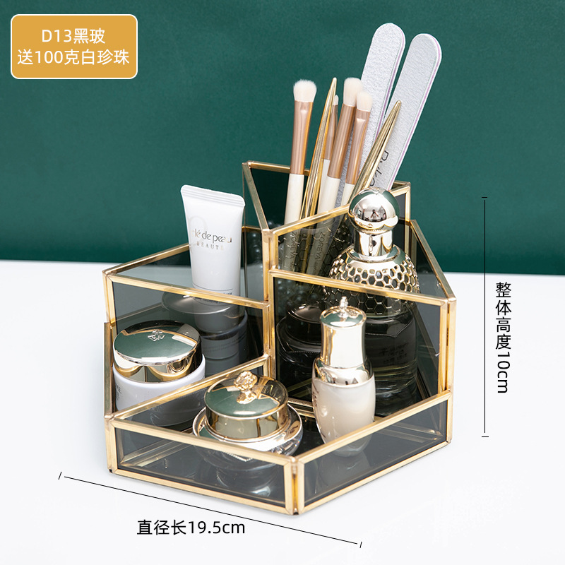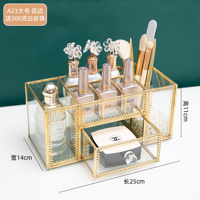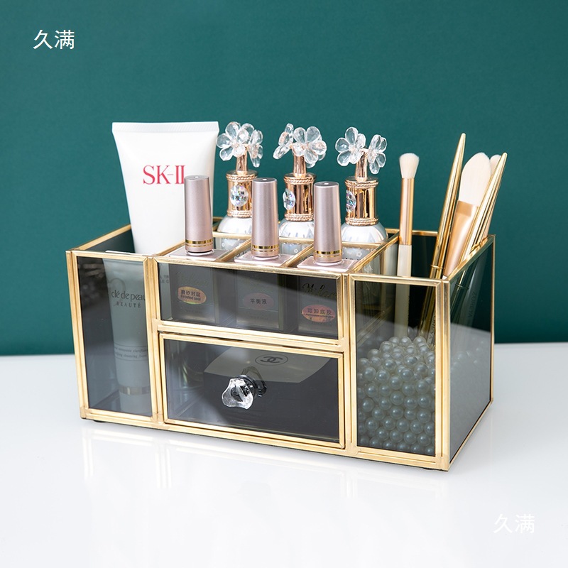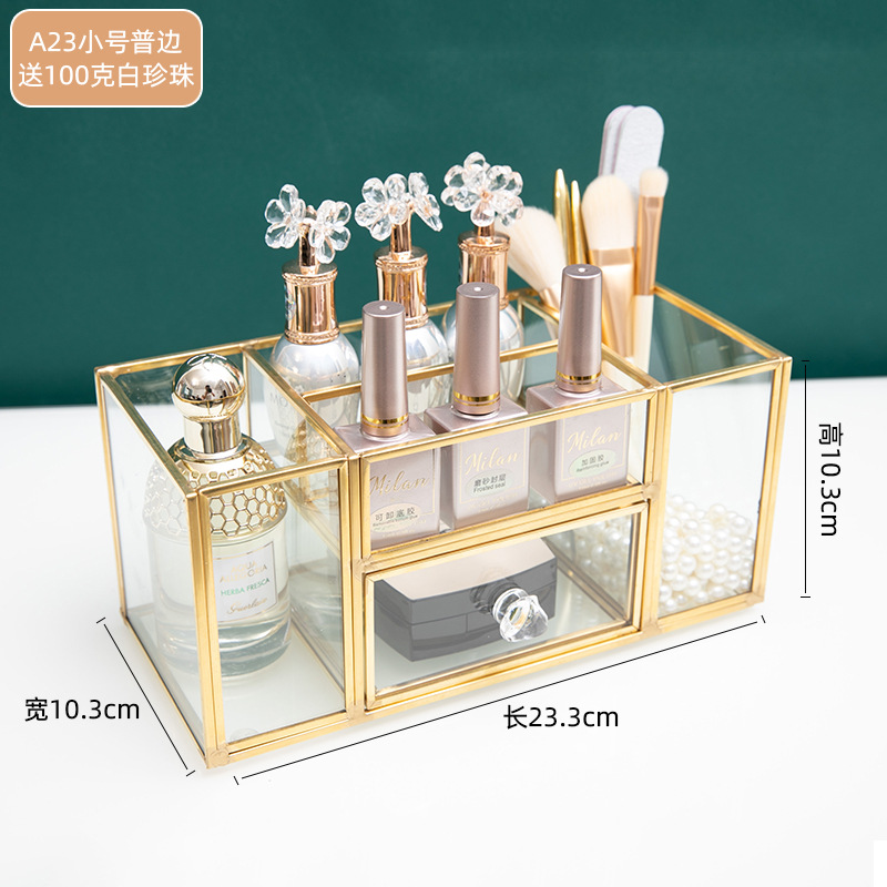Главная страница > Ящик для хранения дизайна ногтей, легкий роскошный настольный стеклянный ящик для хранения косметики, туалетный столик, стеллаж для хранения кистей для макияжа, золотой край
