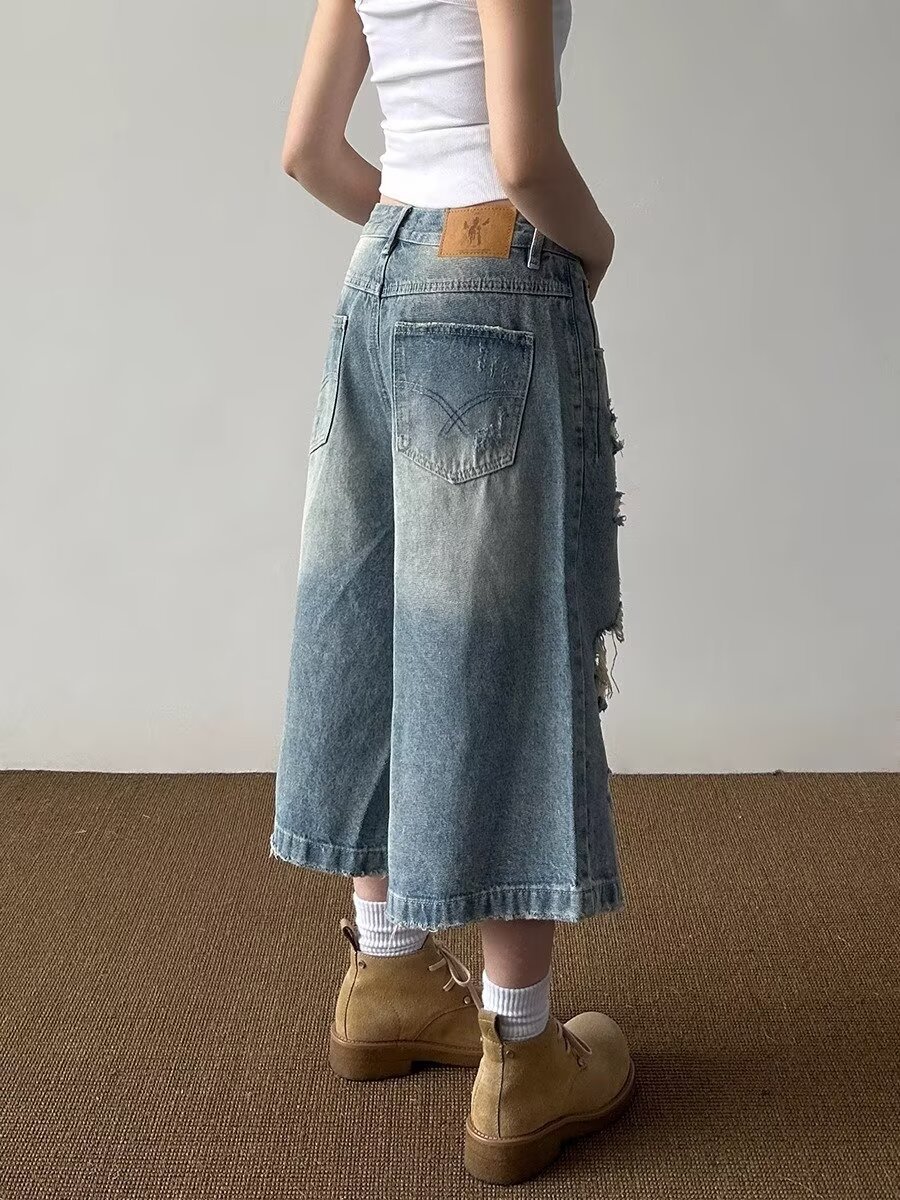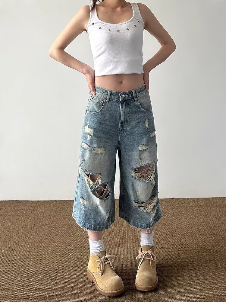 Главная страница > Женские укороченные джинсовые брюки с рваными краями в американском стиле, летний уличный дизайн, свободные драпированные широкие брюки средней длины больших размеров.