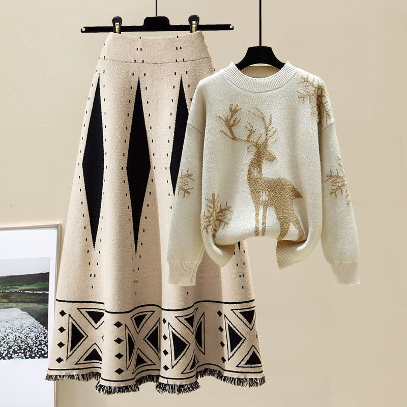 1622 Серый свитер Абрикосовая юбка [Набор из двух частей