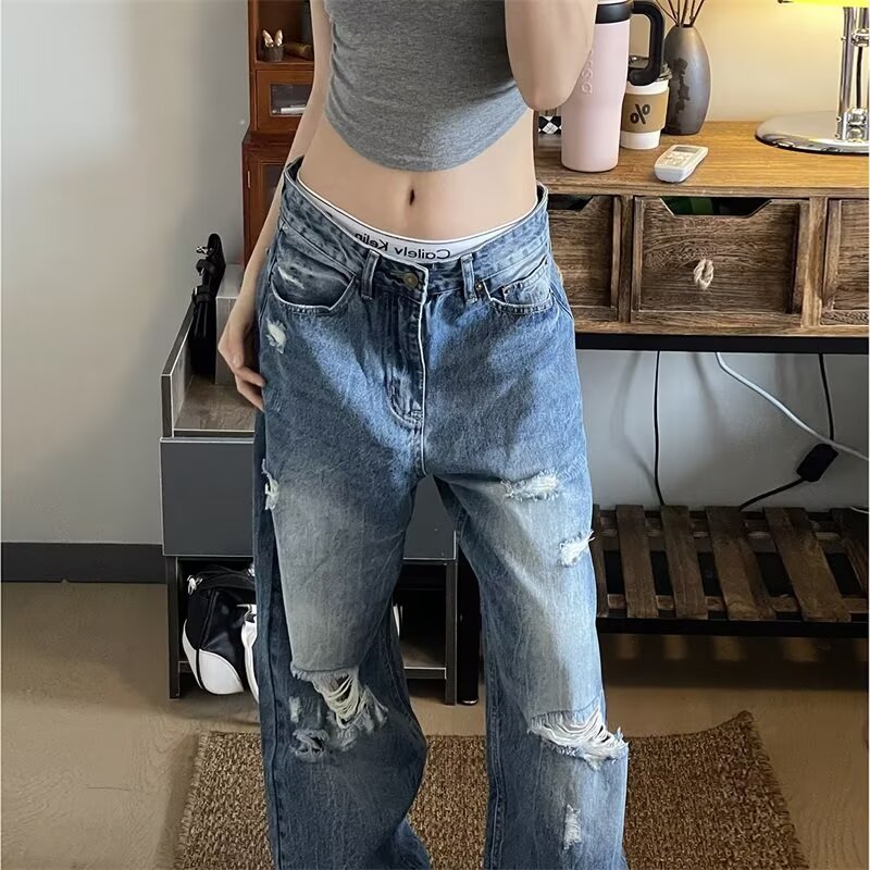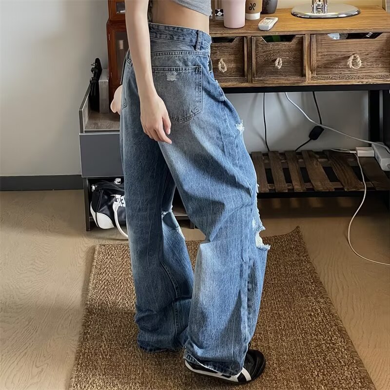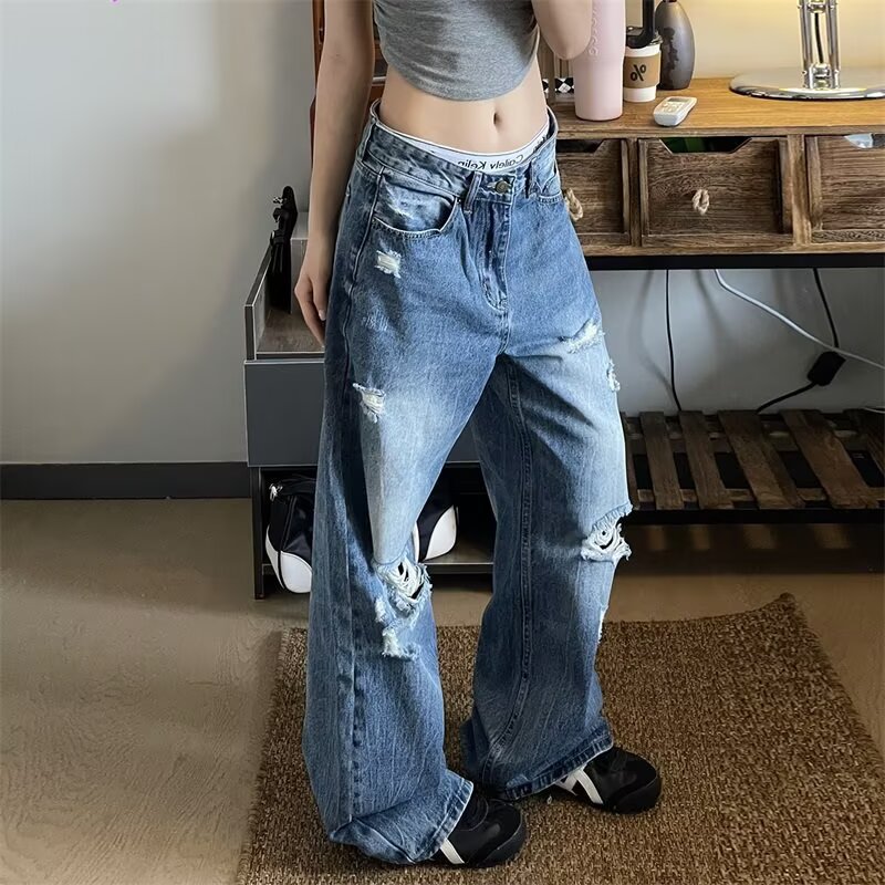 Главная страница > Женские рваные джинсы в американском стиле ретро, летние свободные утягивающие прямые брюки больших размеров с высокой талией и широкими штанинами в пол для женщин больших размеров.