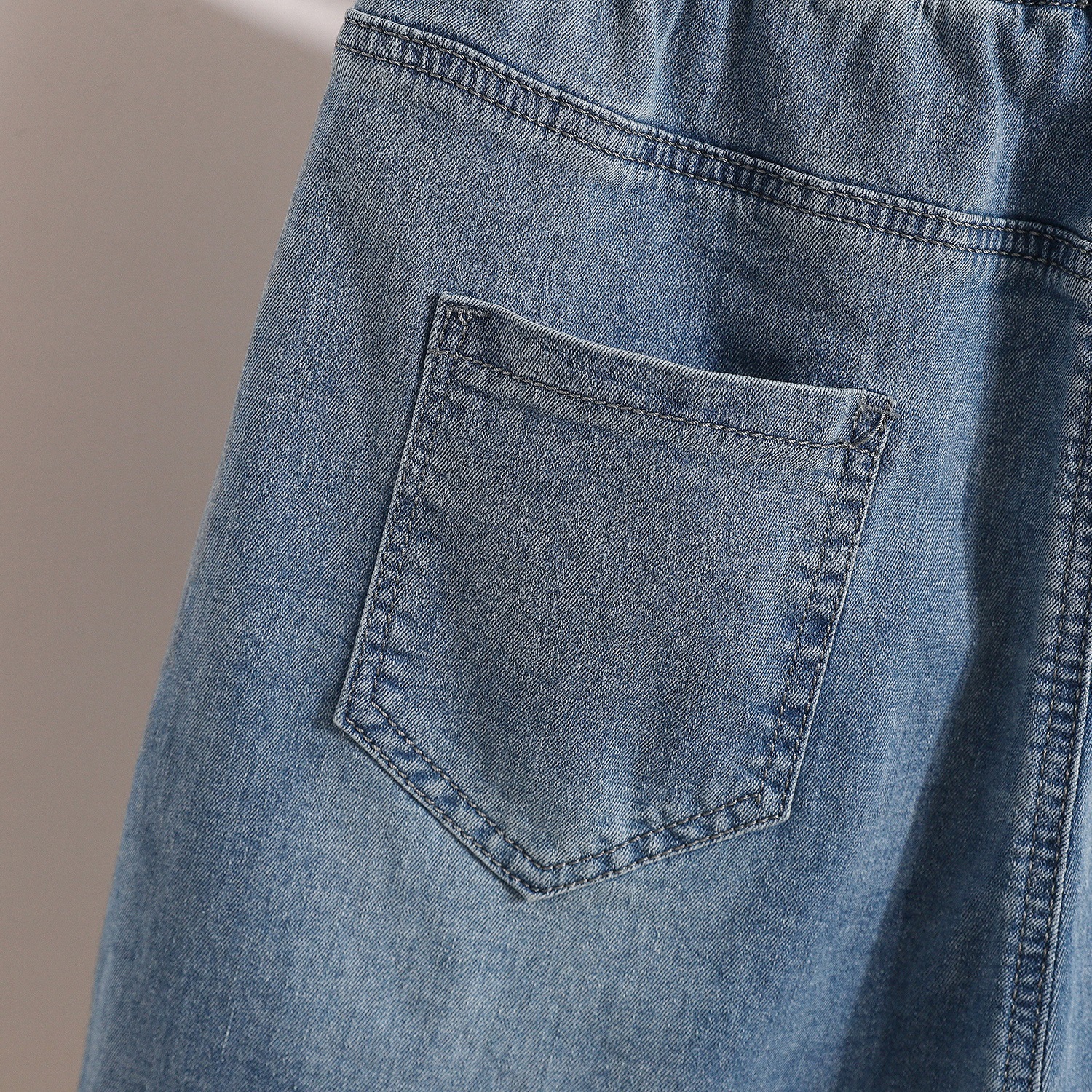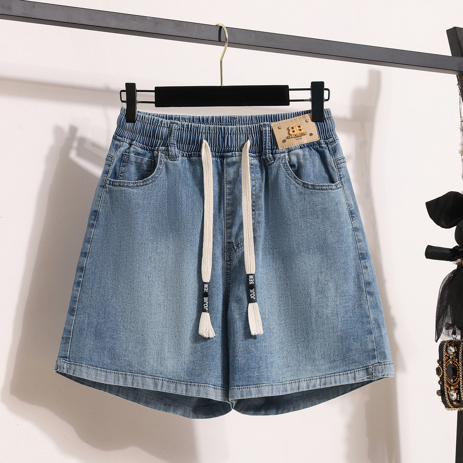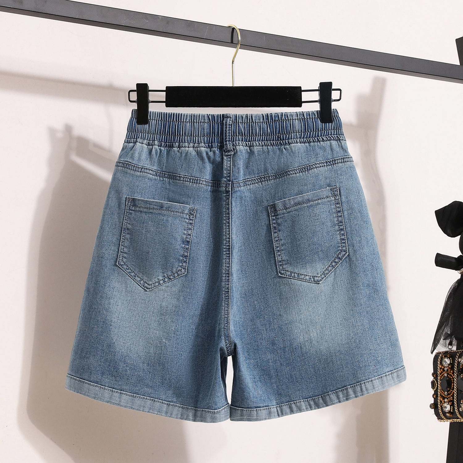 Женские джинсовые шорты из ледяного шелка больших размеров, летняя тонкая модель 2025 года, эластичная талия, утягивающие, широкие шорты до колена.