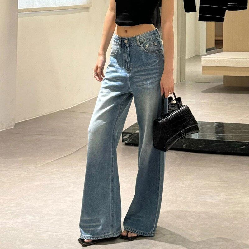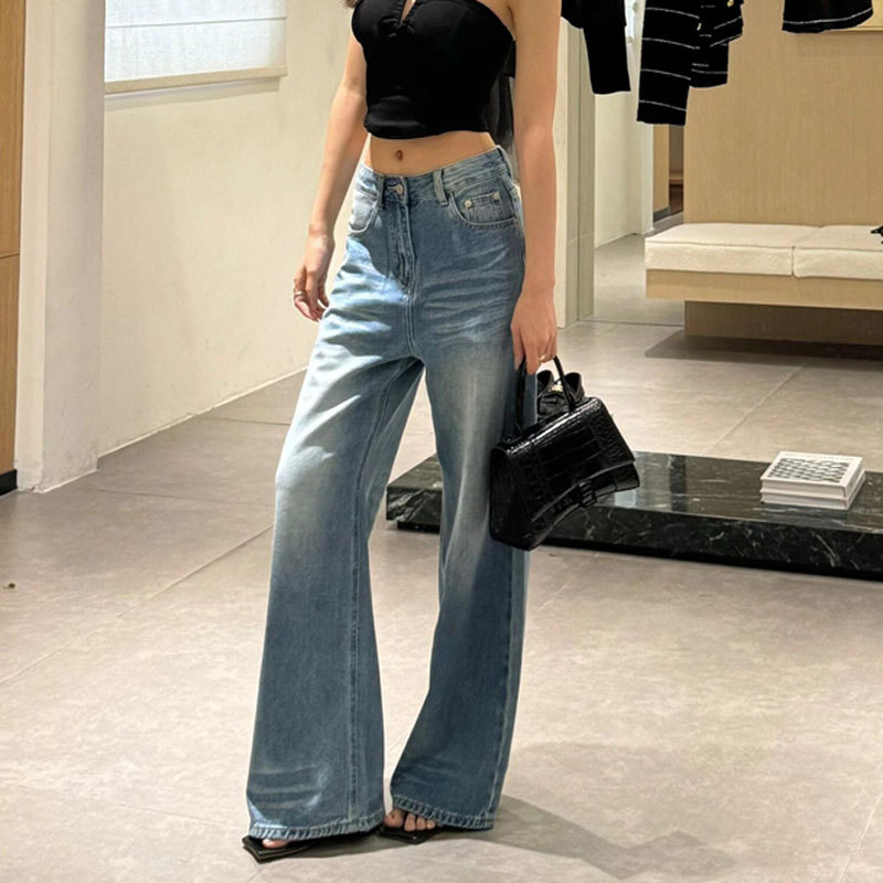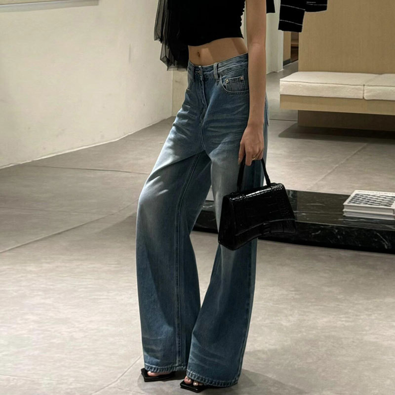 Главная страница > Джинсы для женщин больших размеров с выцветшим дизайном складок, закрывающие бедра, новые свободные широкие брюки длиной до пола с высокой талией.