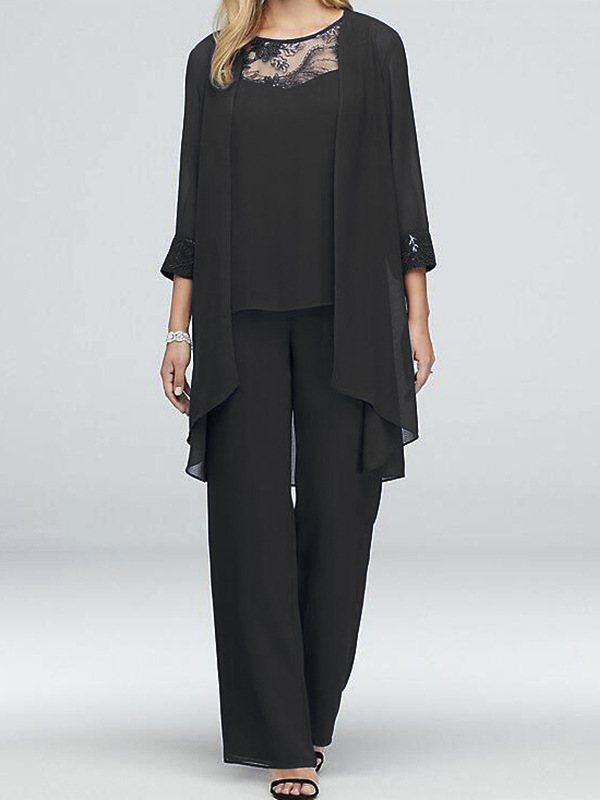Главная страница > Европейский и американский трансграничный модный костюм с круглым вырезом и кружевной отстрочкой, шифоновый кардиган, прямые брюки, Женский костюм-тройка