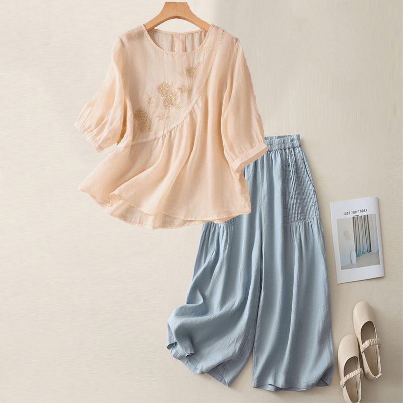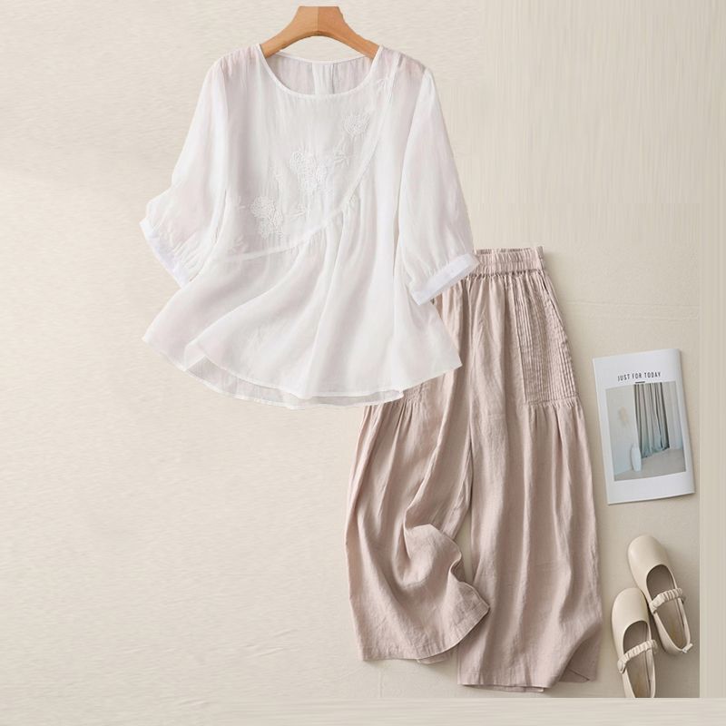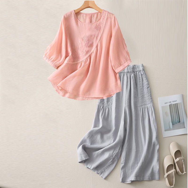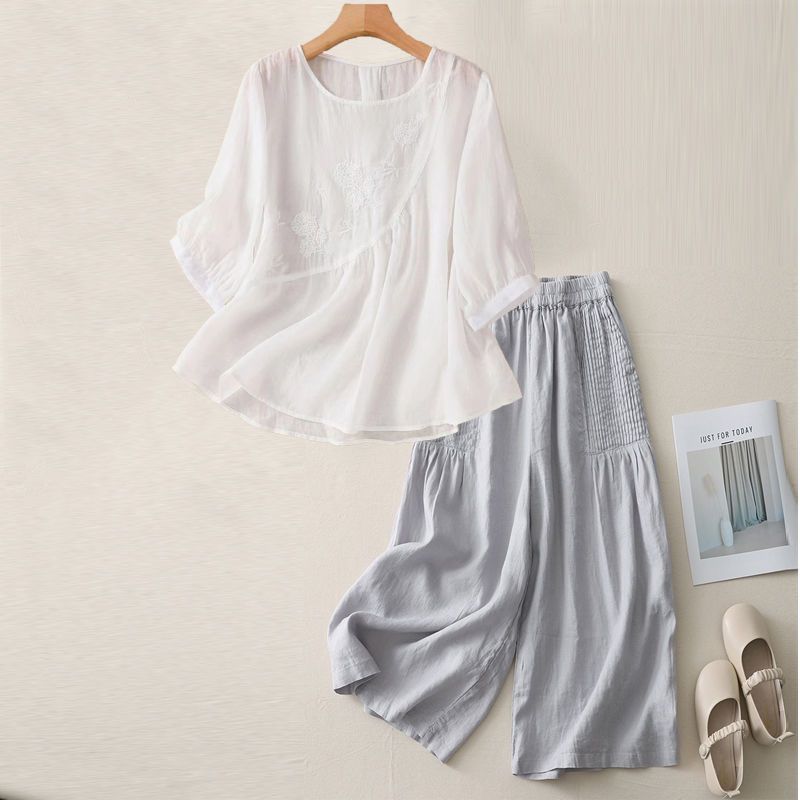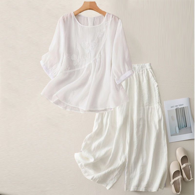 Главная страница > Летний новый топ и брюки в два предмета, модный костюм, свободный крой, эластичная талия, широкие брюки, хлопок и лен, вышитый топ для женщин