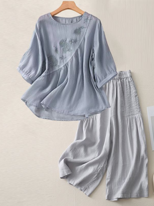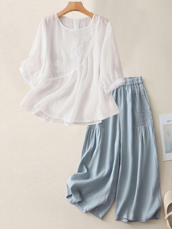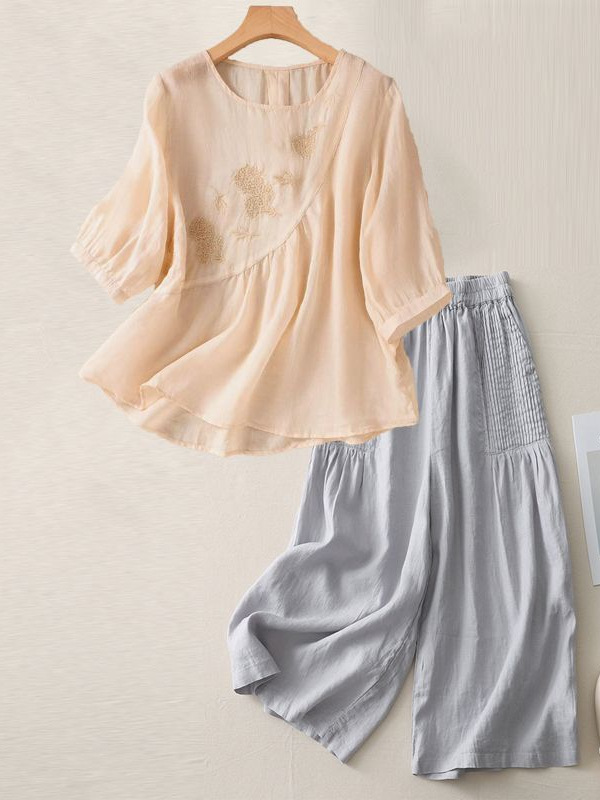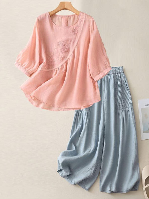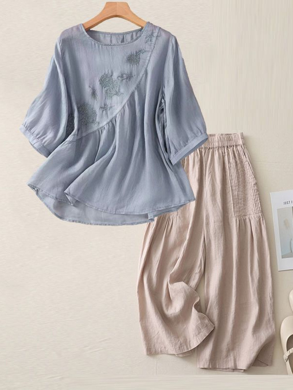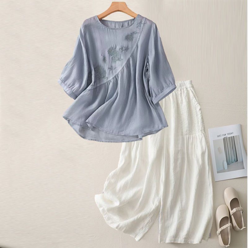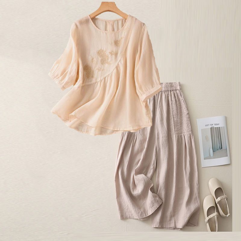 Главная страница > Летний новый топ и брюки в два предмета, модный костюм, свободный крой, эластичная талия, широкие брюки, хлопок и лен, вышитый топ для женщин