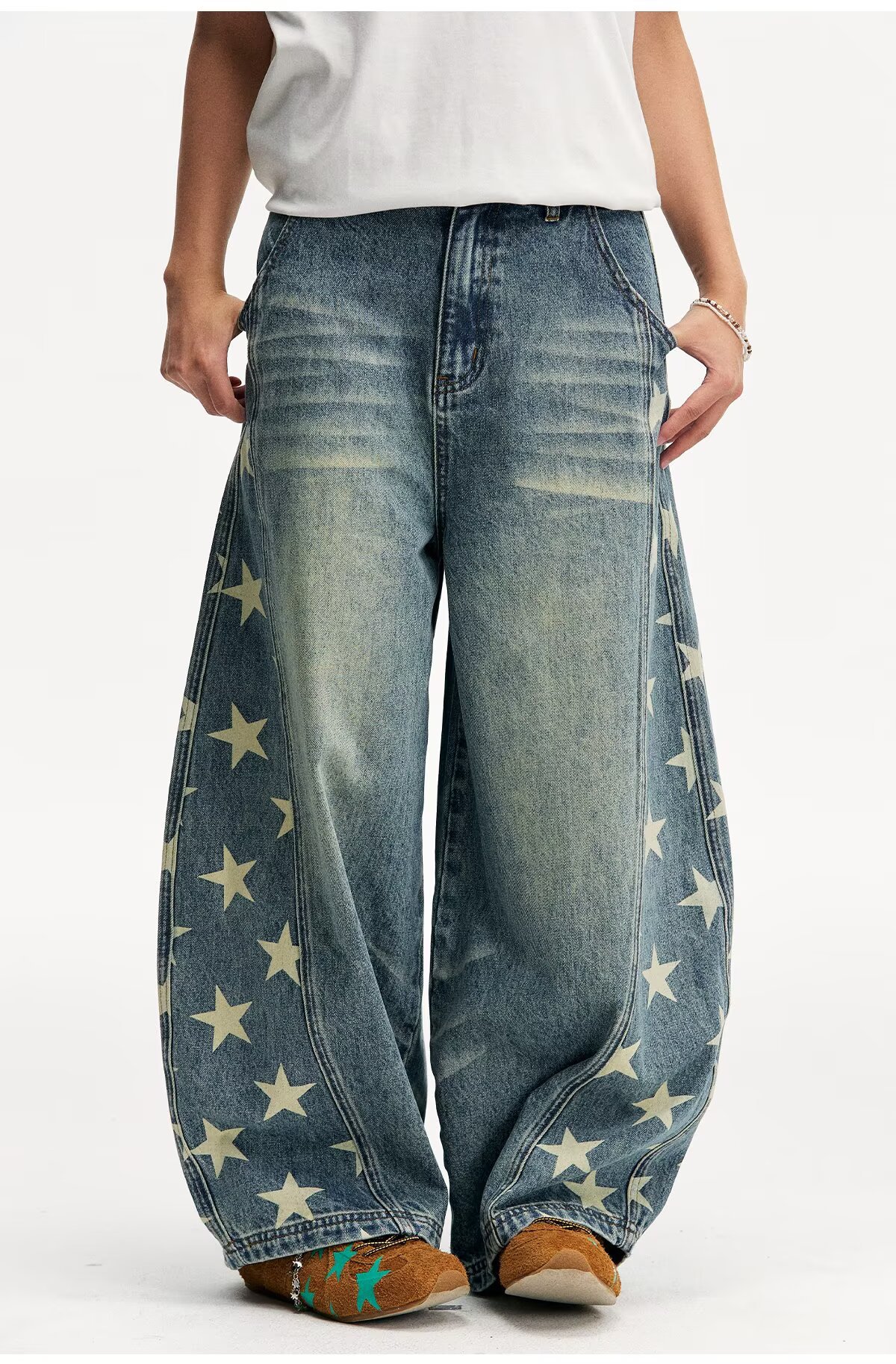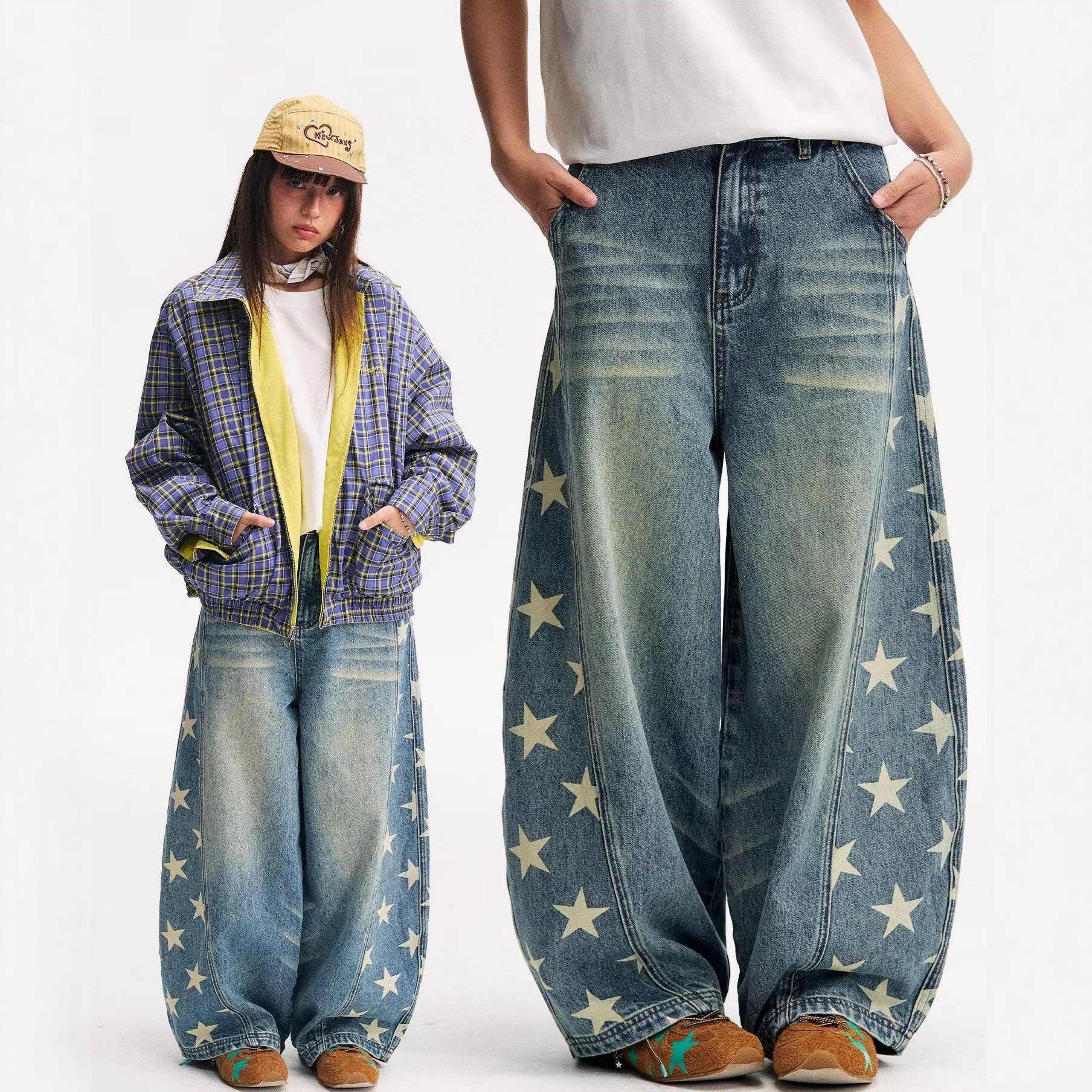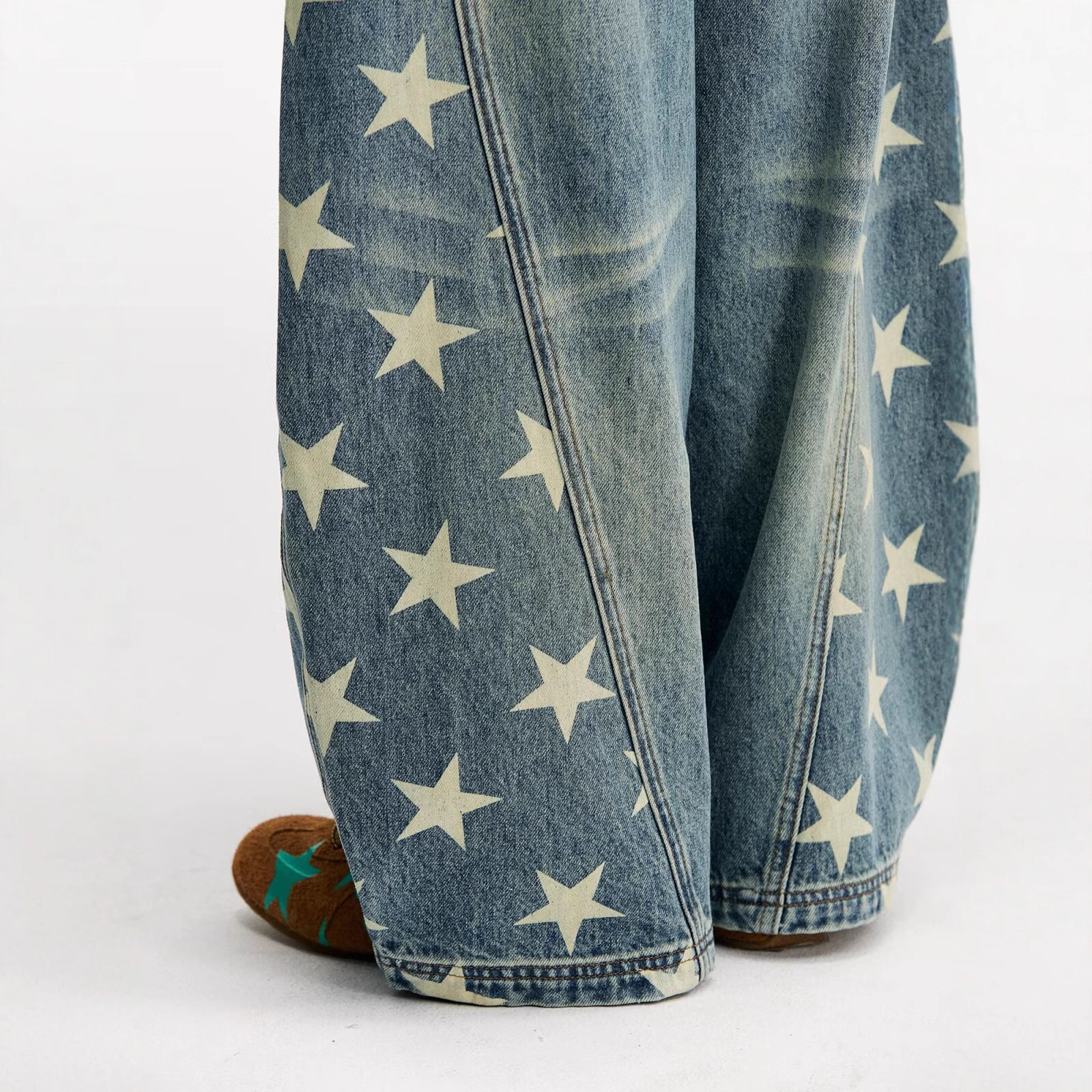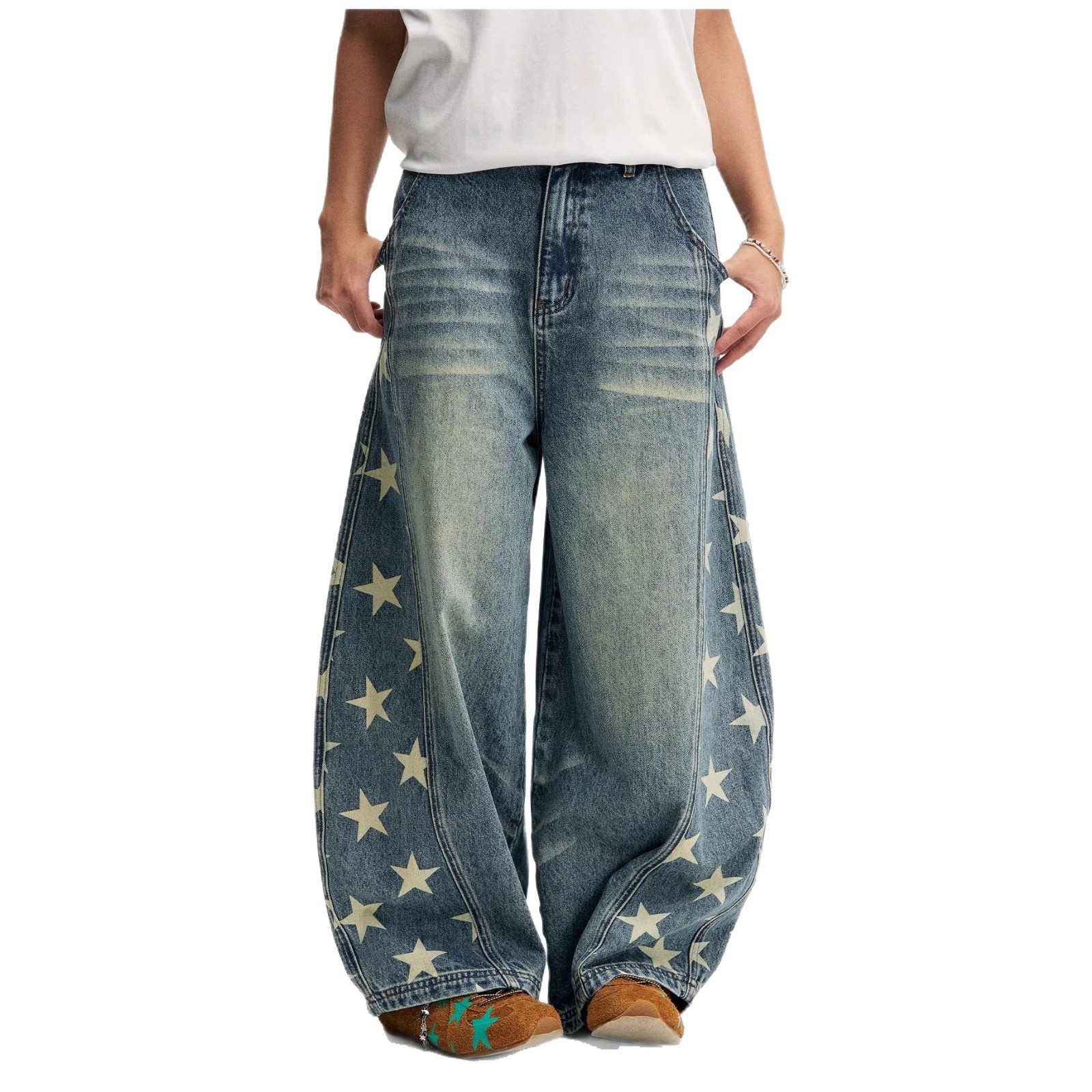Главная страница > 设计感星星侧边切割印花阔腿牛仔裤女潮流百搭宽松高街嘻哈弯刀裤