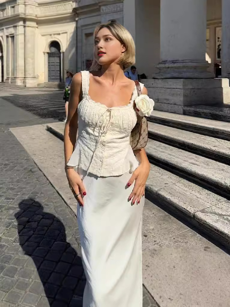 Главная страница > 2024, новый летний стиль, элегантный кружевной топ с квадратным воротником и высокой талией, тонкий тонкий костюм с юбкой «рыбий хвост» для женщин