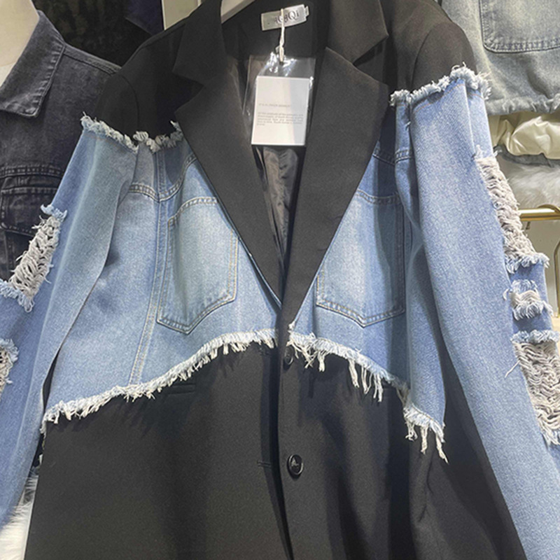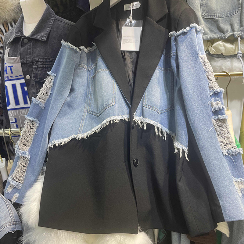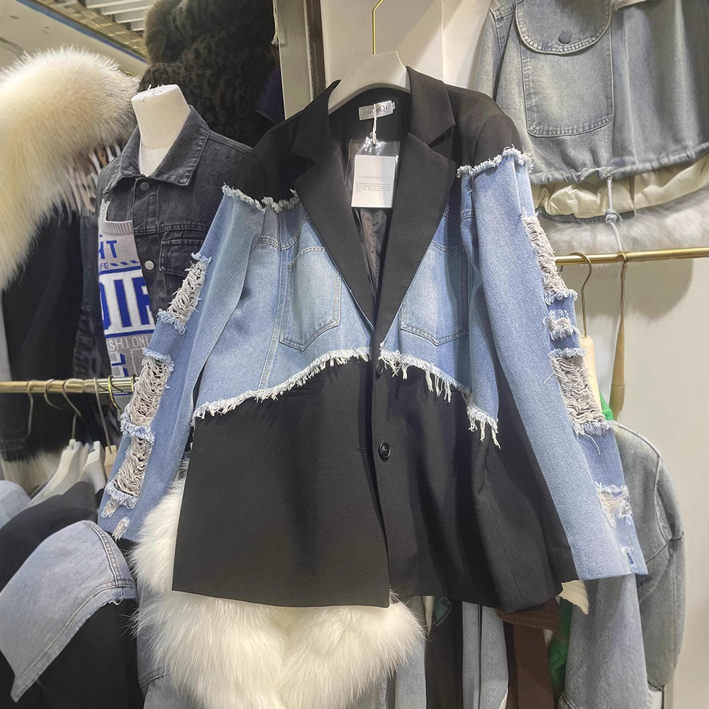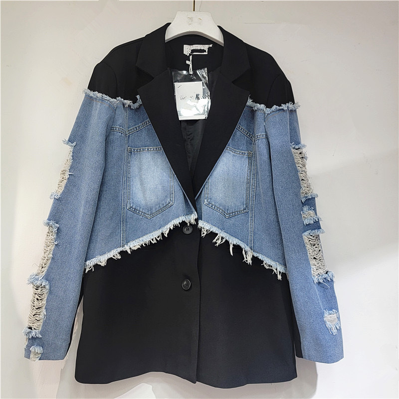 Главная страница > Европейская версия женской шерстяной джинсовой куртки женская осень новая контрастная сшитая куртка трендовый дизайн топ
