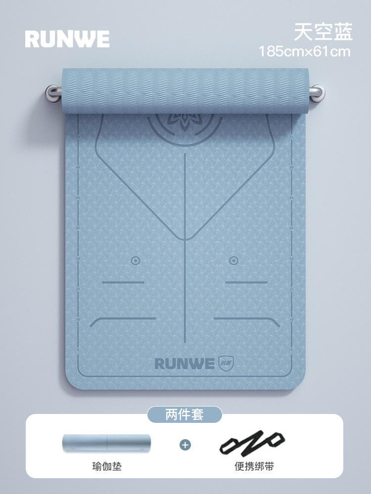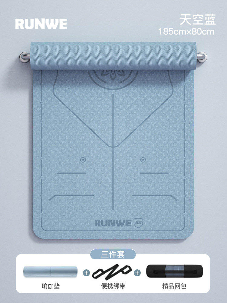Небесно-голубой комплект из трех предметов с линией осанки 185*80 см [коврик для йоги + сумка для хранения + ремни] утолщенный/нескользящий/