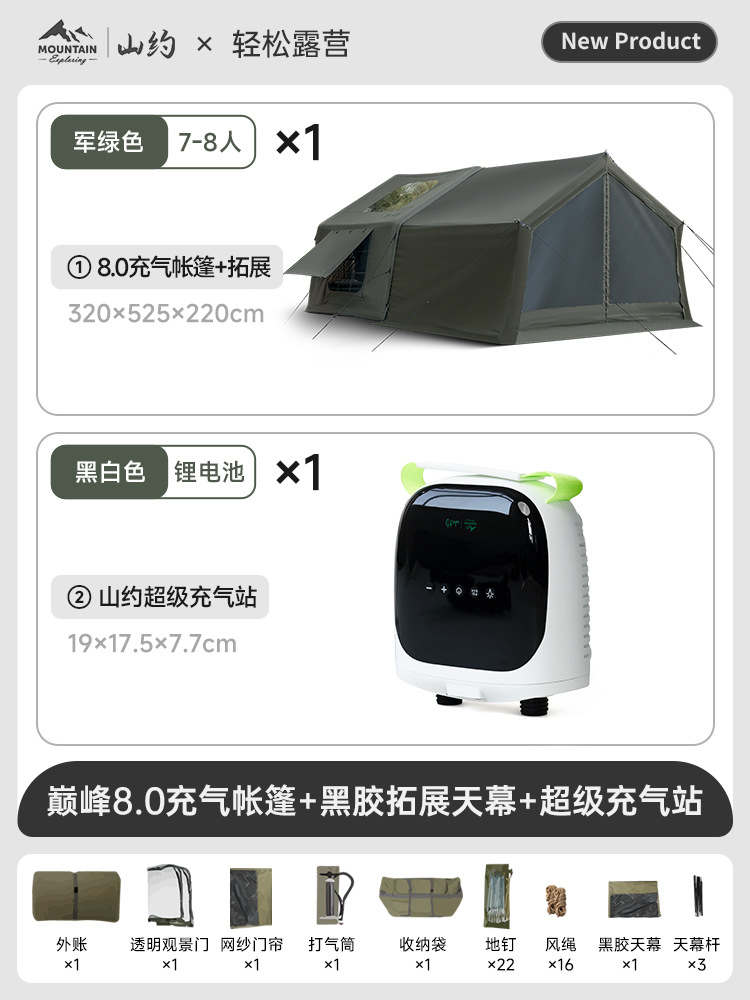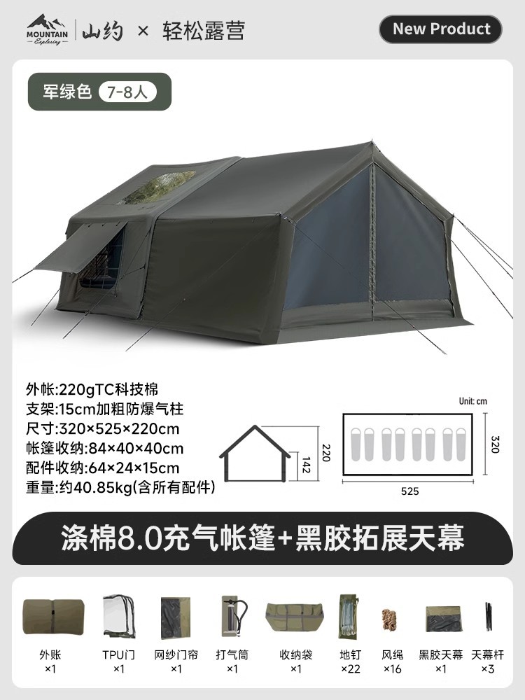 Пик·Хлопок【8+8,8㎡】Основная палатка + виниловый навес + дверь из ТПУ + сетчатая занавеска + 3 стойки навеса + супернадувная станция