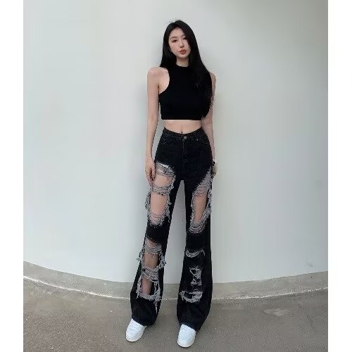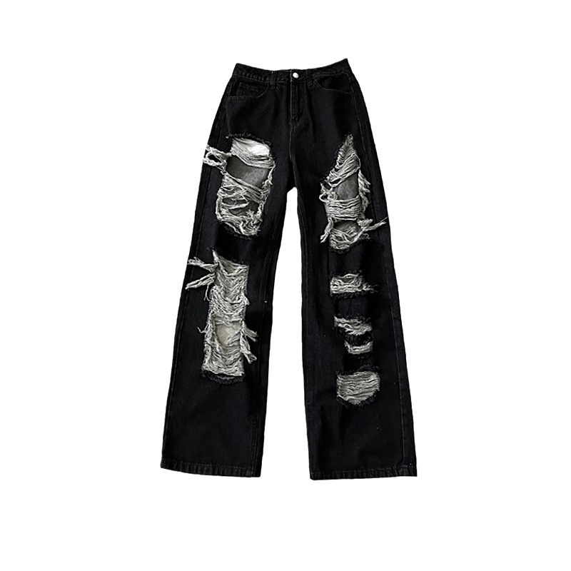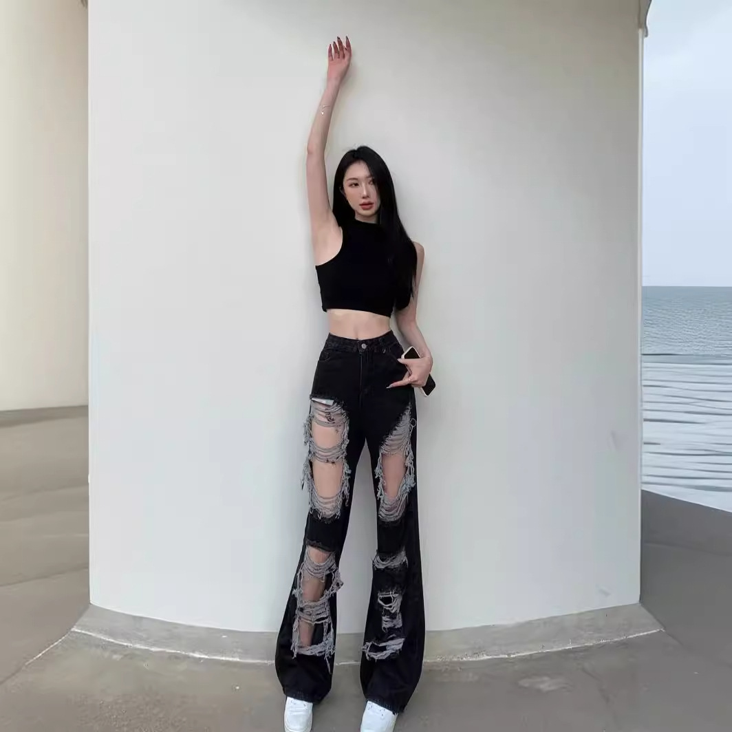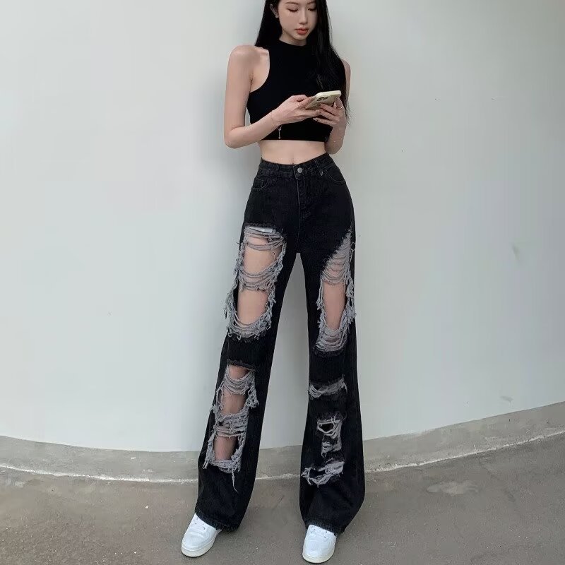 Гонконгский ветер нищий сломал дыру в джинсах женские летние прямые широкие ноги