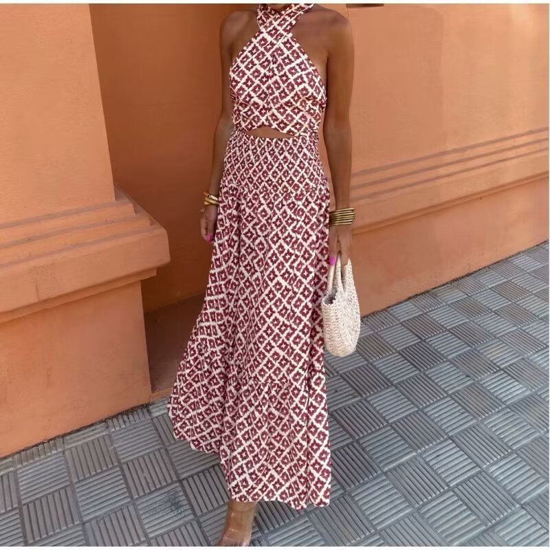 Главная страница > Трансграничная внешняя торговля, европейская и американская одежда, летний новый стиль, модный костюм с юбкой с принтом и бретелькой на шее