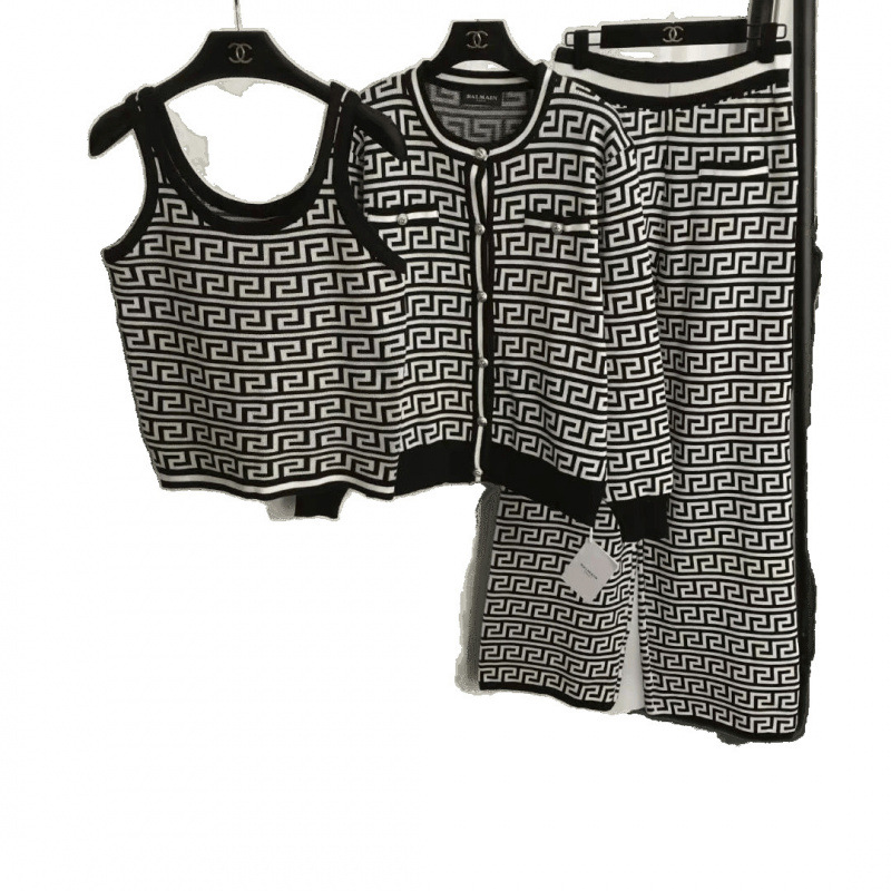 Главная страница > Женский костюм-тройка на осень-зиму: жаккардовый трикотажный кардиган, жилет и брюки с высокой талией, прямого кроя, широкие штанины, утягивающий эффект.