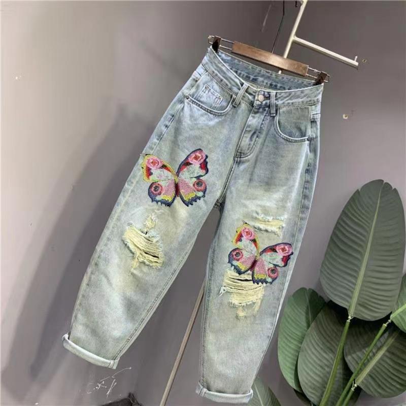 [Собралось 2235 человек] Европейские рваные джинсы с вышивкой бабочки, женские повседневные шаровары 100kg года, широкие большие размеры