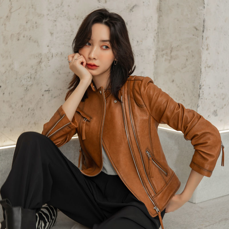 Главная страница > Модная куртка из натуральной кожи Haining, с воротником-стойкой, короткая, в корейском стиле, приталенная, женская кожаная куртка.