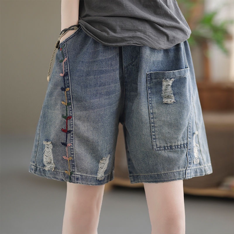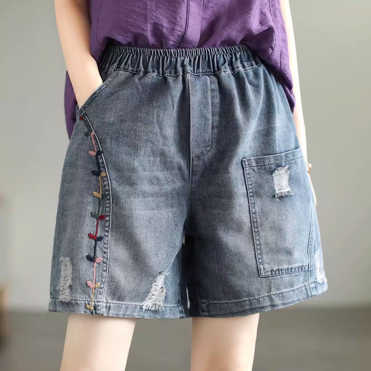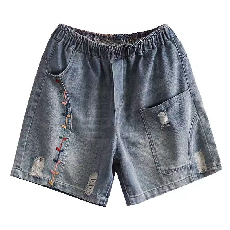Главная страница > Новые летние женские джинсовые шорты с эластичной резинкой на талии, свободного кроя, светлого цвета с вышивкой, утягивающие прямые шорты средней длины, больших размеров.