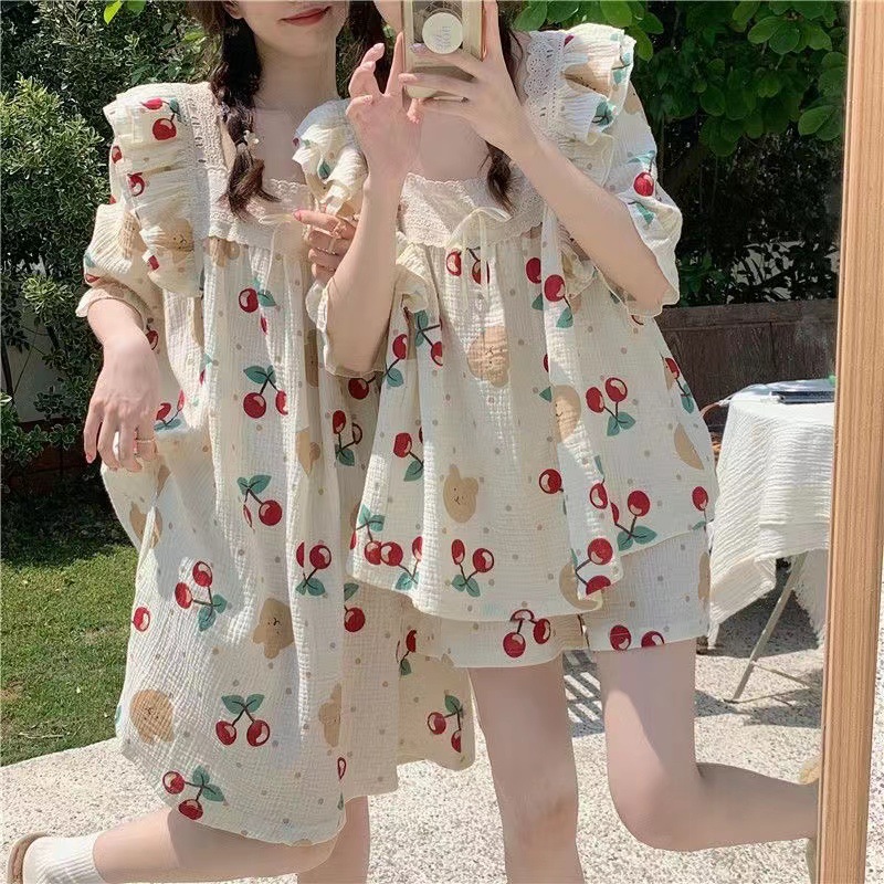 Квадратный воротник Cherry Bear NightDress (пузырьковая хлопковая)