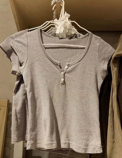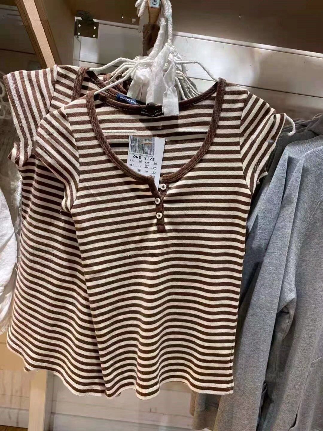 Главная страница > Бренди в стиле BM, эластичная тонкая футболка в американскую полоску, Женский пуловер с короткими рукавами и тремя пуговицами
