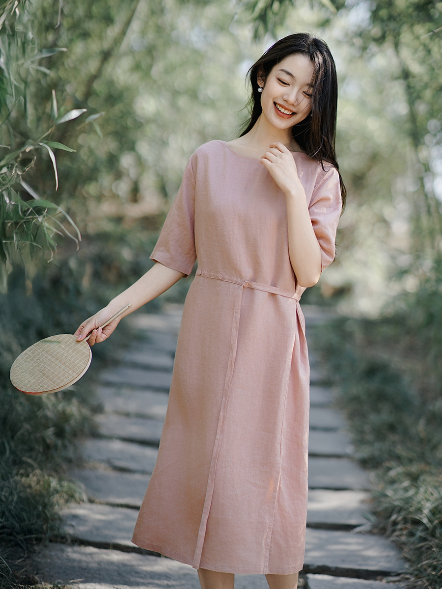 Главная страница > Новая китайская женская одежда 2025 лето новое чувство дизайна с короткими рукавами Рами платье с круглым вырезом и талией ретро платье