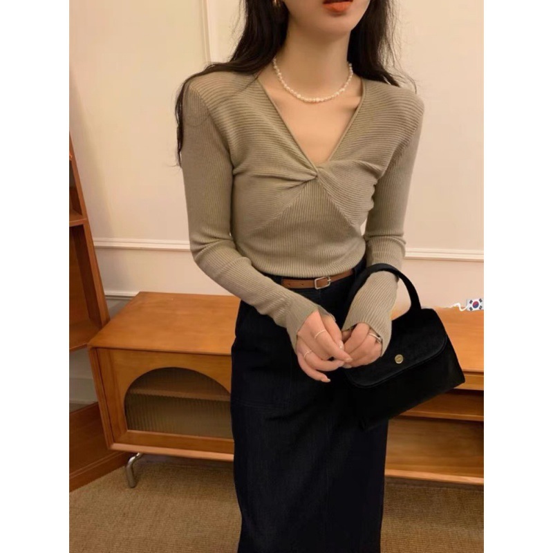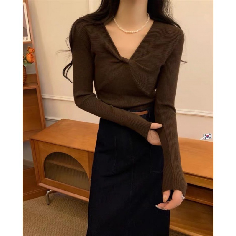 Главная страница > Ранняя осенняя абрикосовая трикотажная рубашка в корейском стиле с v-образным вырезом и закрученным дизайном из тонкой шерсти на талии, утягивающий топ для женщин