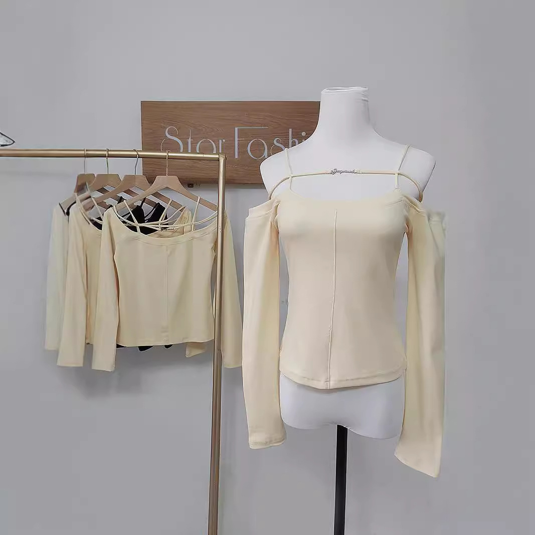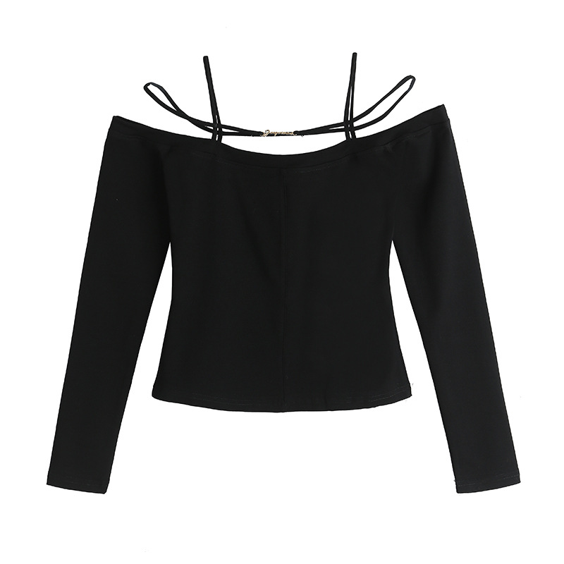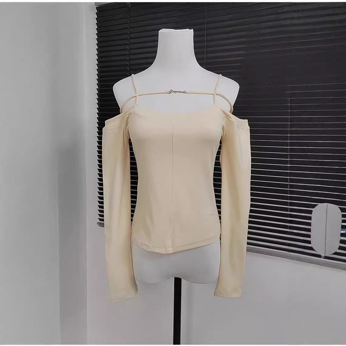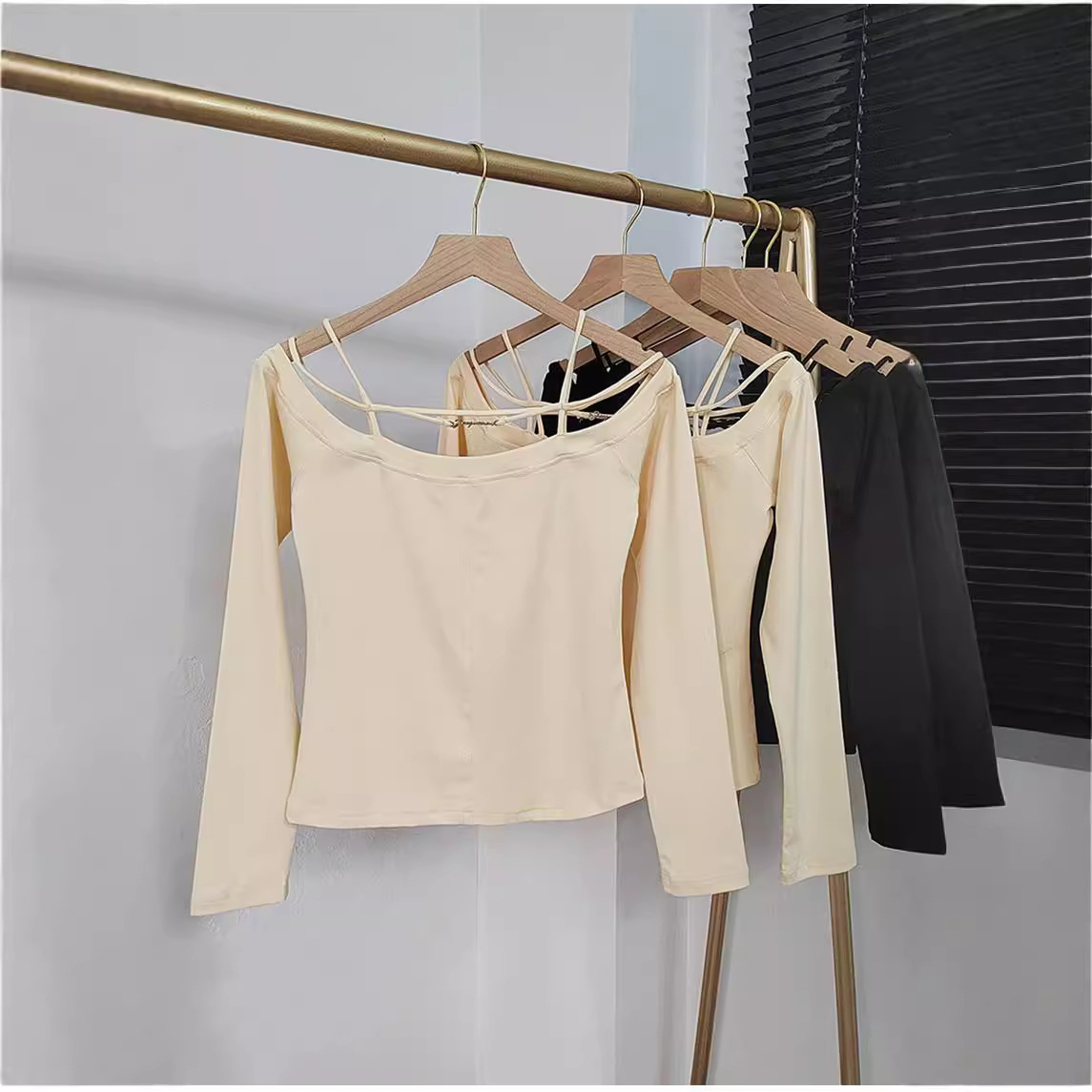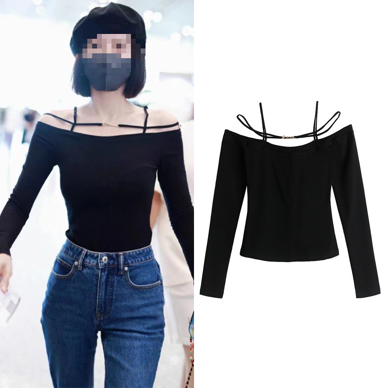 Главная страница > Долгосрочный запас: осенняя женская базовая футболка с открытыми плечами и воротником-стойкой в стиле Xu Mengjie Jennie Qin Lan, коллекция 2025 года